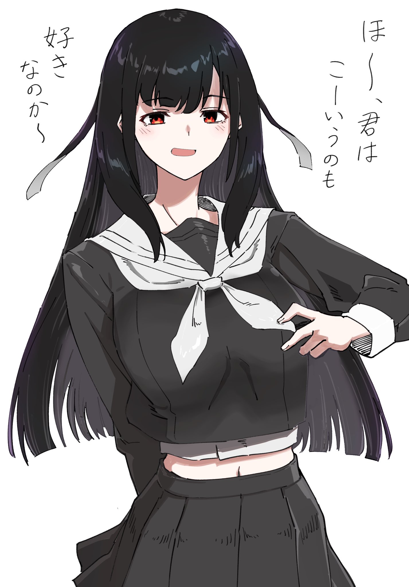1girl black_hair black_serafuku breasts cosplay highres kurohime_(fate) kurohime_(fate)_(cosplay) large_breasts long_hair minorun9 navel nue_(nue_no_onmyouji) nue_no_onmyouji red_eyes school_uniform serafuku smile