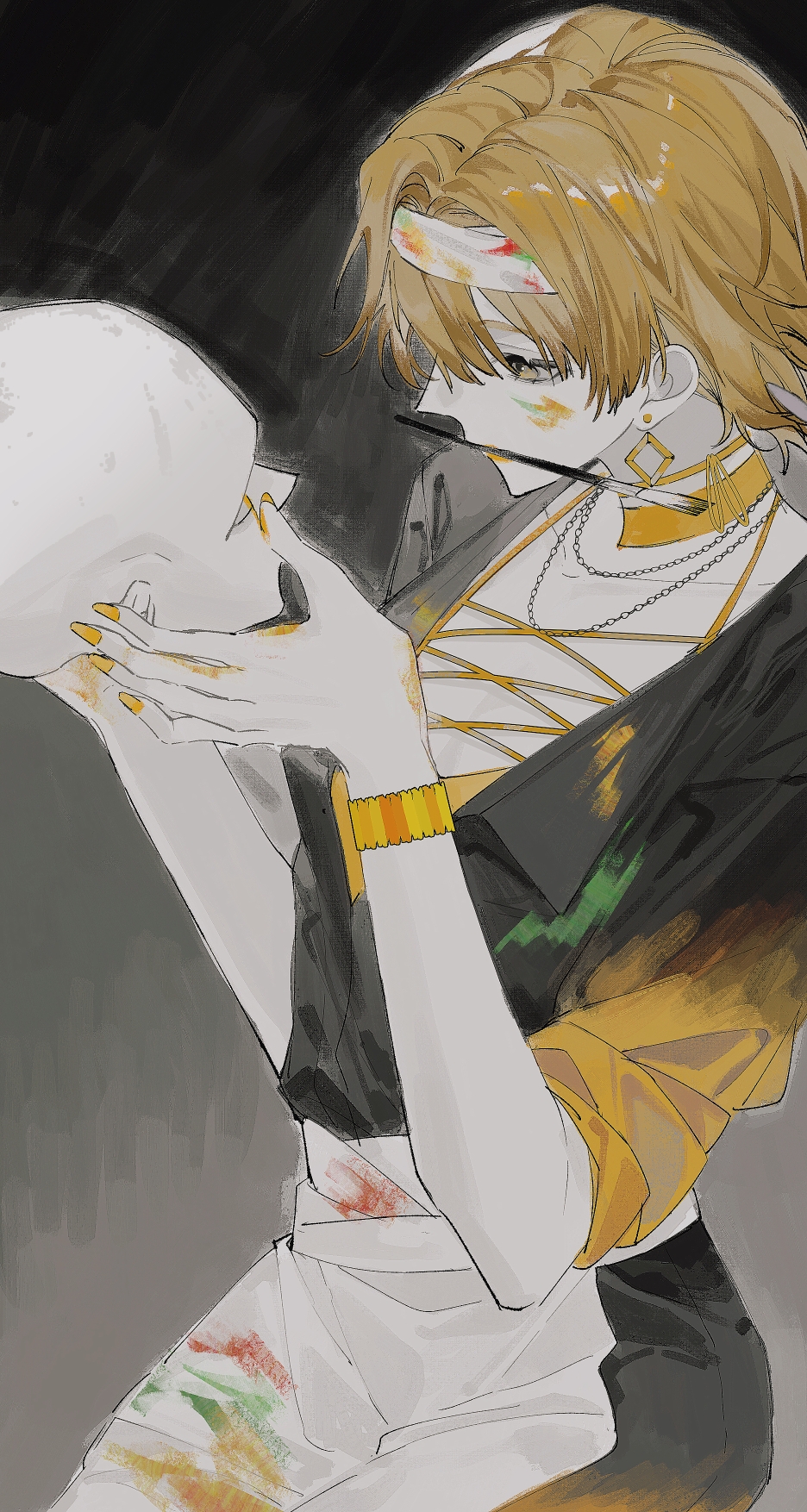 16personalities 1girl adventurer_(16personalities) black_jacket blonde_hair bracelet feitianxianyu hairband headband highres holding_detached_head jacket jewelry long_sleeves nail_polish paint_on_body paint_on_clothes pants short_hair sitting solo white_hairband white_headband white_pants yellow_eyes yellow_nails