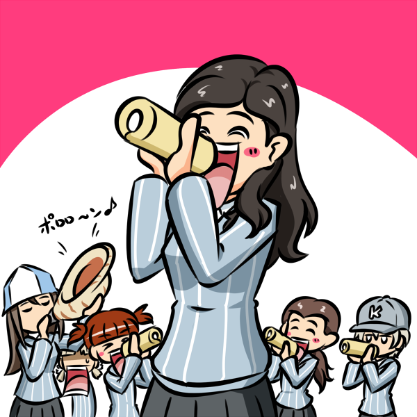 6+girls aki_(girls_und_panzer) baseball_cap black_hair black_skirt blue_sweater brown_hair girls_und_panzer grey_hair hat holding holding_instrument horn_(instrument) instrument keizoku_school_uniform kogane_(staygold) long_hair mika_(girls_und_panzer) mikko_(girls_und_panzer) miniskirt multiple_girls open_mouth pleated_skirt ponytail red_hair school_uniform shirt short_hair short_twintails skirt striped_hat sweater tami_(girls_und_panzer) tomi_(girls_und_panzer) twintails vertical-striped_sweater white_shirt youko_(girls_und_panzer)