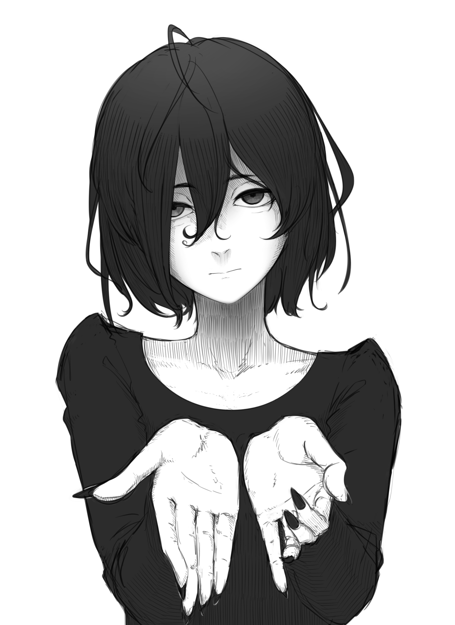 1girl absurdres commentary_request expressionless fingernails greyscale hair_between_eyes hands_up highres long_fingernails looking_at_viewer mji_(emucchi) monochrome original palms shirt short_hair simple_background solo