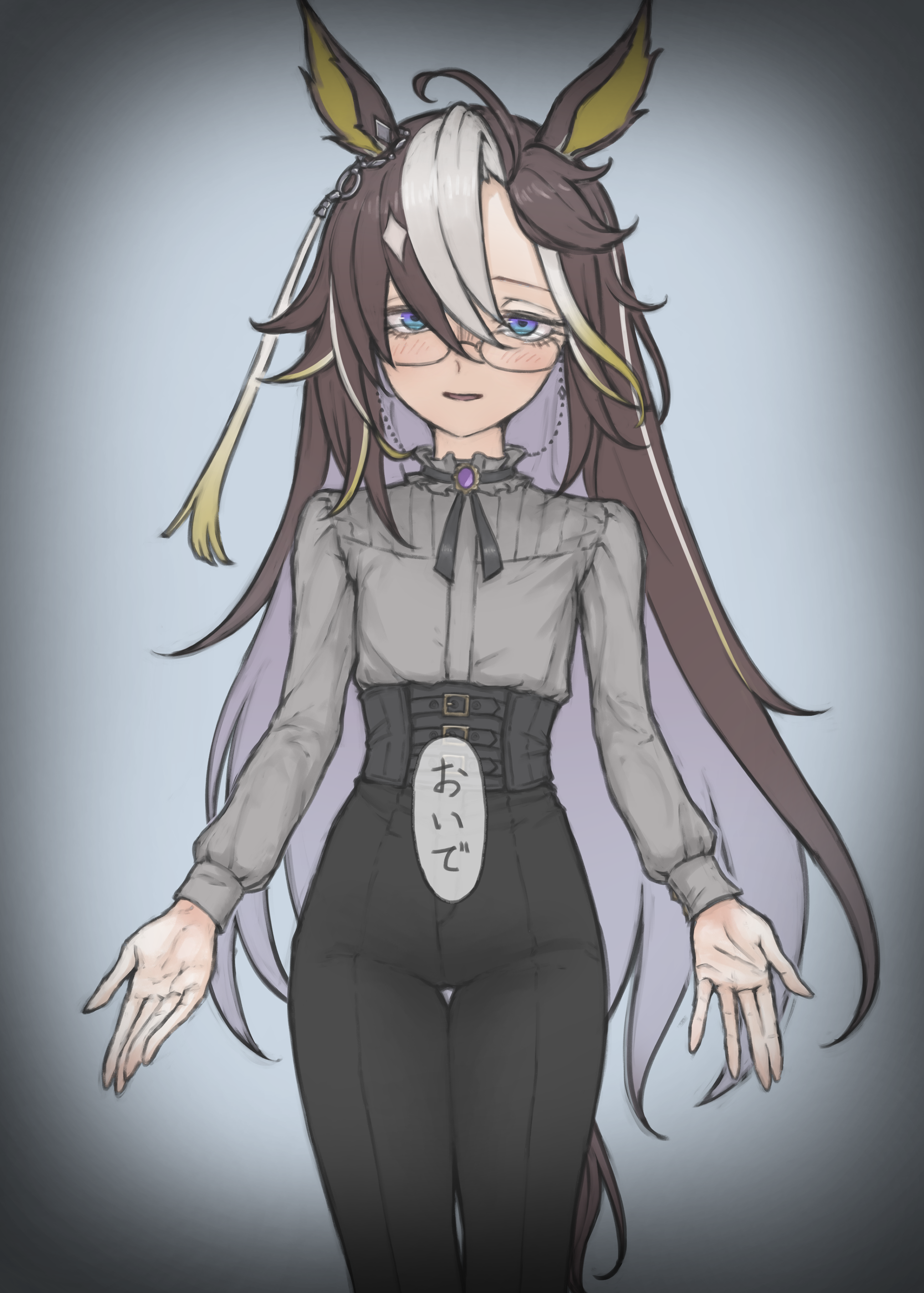 1girl absurdres ahoge animal_ears black_pants blue_eyes brown_hair commentary_request dream_journey_(umamusume) flat_chest glasses grey_shirt highres horse_ears horse_girl horse_tail light_smile long_hair looking_at_viewer mji_(emucchi) multicolored_hair outstretched_hand pants parted_lips shirt simple_background solo tail thigh_gap translation_request two-tone_hair umamusume very_long_hair white_hair