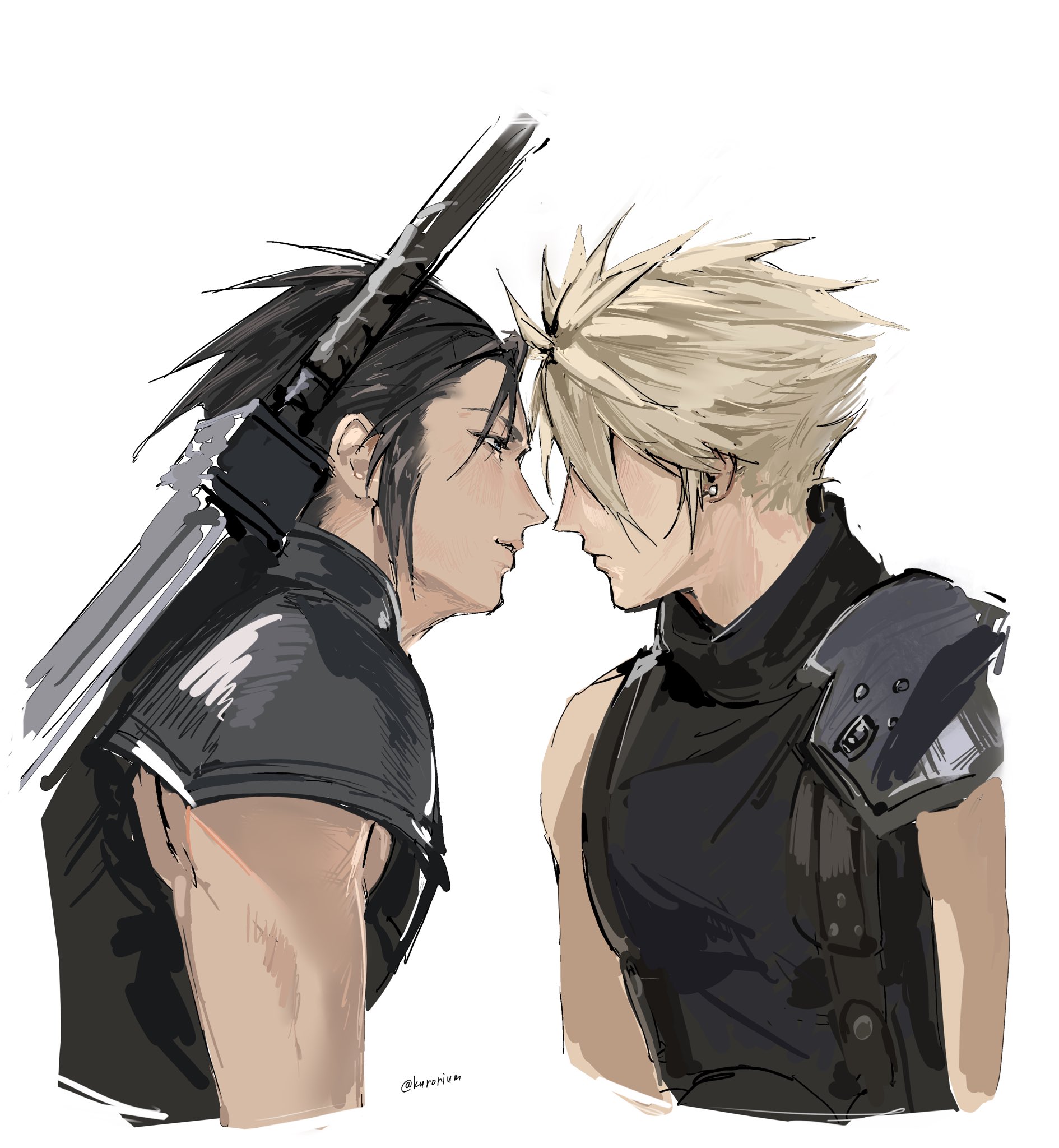 2boys armor black_hair blonde_hair closed_mouth cloud_strife commentary cropped_torso earrings english_commentary final_fantasy final_fantasy_vii highres jewelry kurorium looking_at_another male_focus multiple_boys pauldrons piercing shoulder_armor simple_background single_bare_shoulder single_pauldron stud_earrings sword sword_on_back turtleneck weapon weapon_on_back white_background yaoi zack_fair
