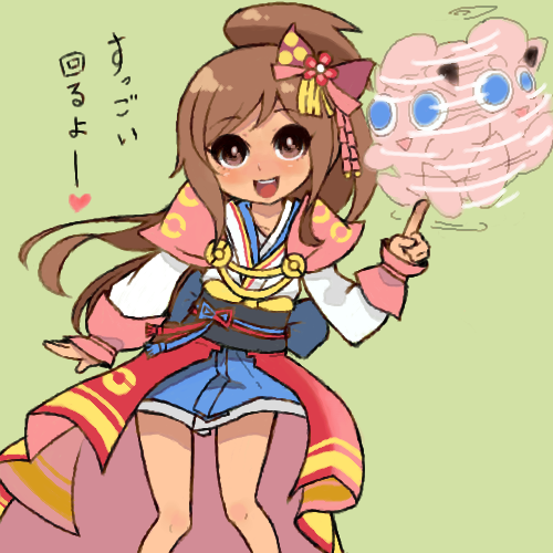 balancing balancing_on_finger blush brown_eyes brown_hair gen_1_pokemon green_background happy japanese_clothes japanese_text jigglypuff kimono motion_blur nintendo oichi_(pokemon_conquest) oichi_(sengoku_musou) pokemon pokemon_conquest sengoku_musou smile spinning