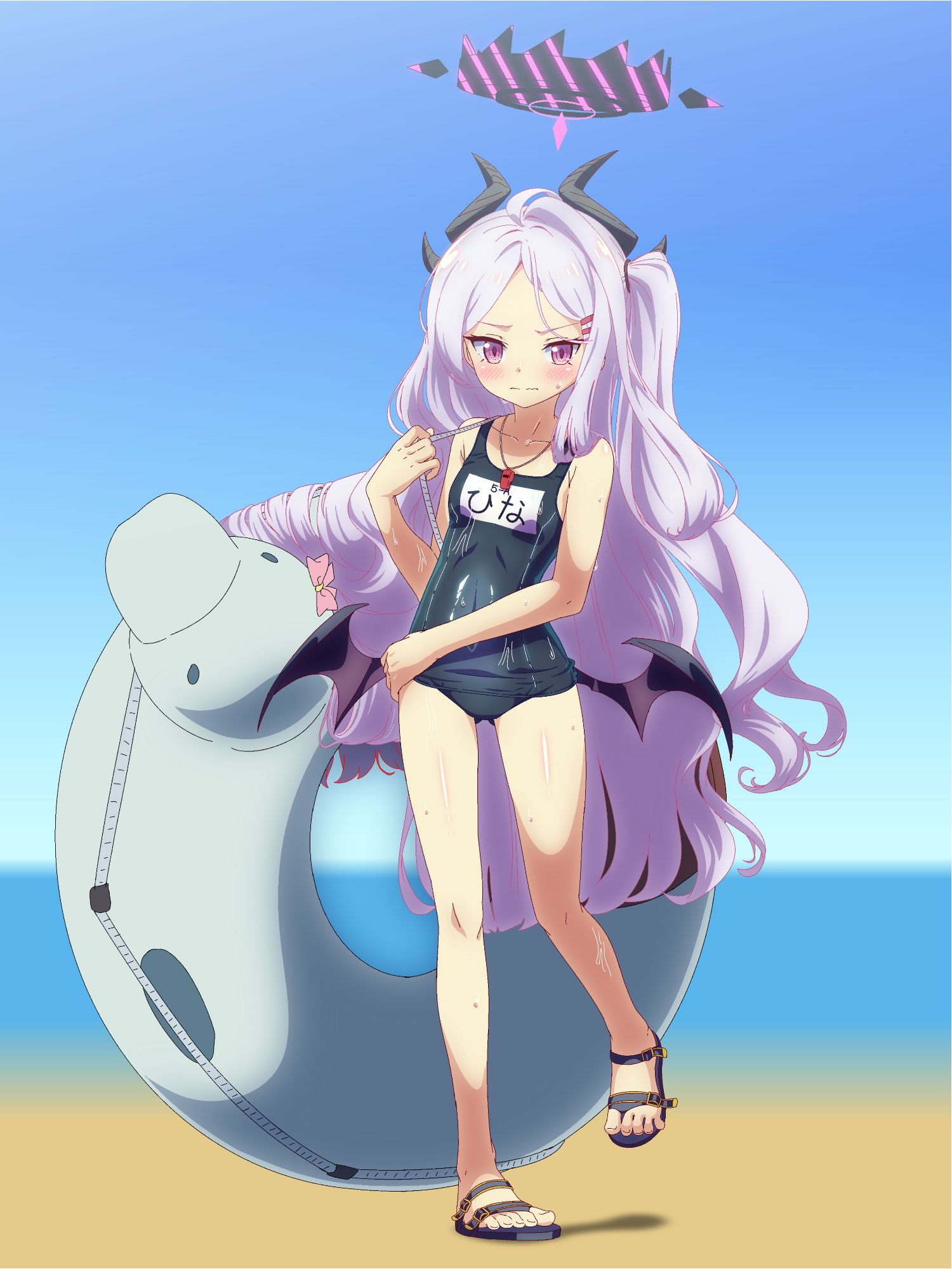 1girl ahoge blue_archive blue_one-piece_swimsuit blush demon_girl demon_horns demon_wings duck_innertube flat_chest hair_ornament hairclip halo highres hina_(blue_archive) hina_(swimsuit)_(blue_archive) horns innertube jin_rey long_hair looking_at_viewer low_wings multiple_horns name_tag official_alternate_costume old_school_swimsuit one-piece_swimsuit parted_bangs purple_eyes purple_wings school_swimsuit solo swim_ring swimsuit very_long_hair whistle whistle_around_neck white_hair wings