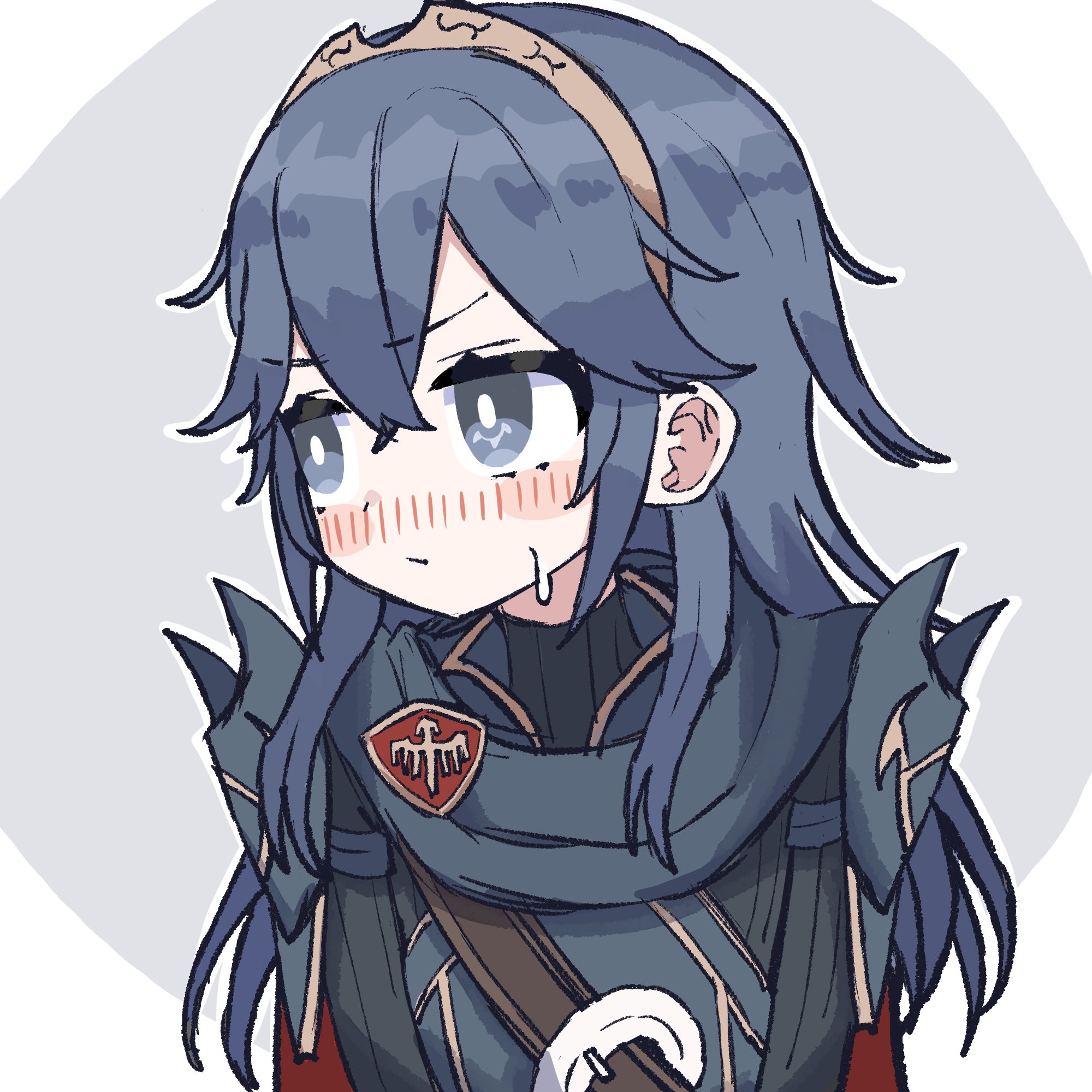 1girl armor blue_eyes blue_hair blush brand_of_the_exalt cape closed_mouth facing_viewer fire_emblem fire_emblem_awakening hair_between_eyes highres jacomodayo long_hair looking_to_the_side lucina_(fire_emblem) nintendo shoulder_armor solo sweatdrop symbol_in_eye tiara upper_body