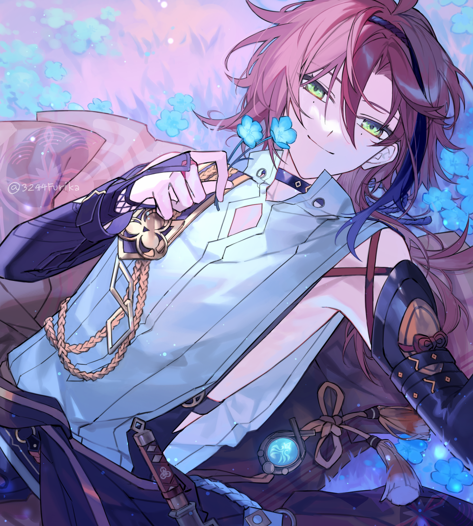 1boy 3244furika artist_name blue_flower commentary flower genshin_impact highres holding holding_flower japanese_clothes long_hair lying mole mole_under_each_eye mole_under_eye multicolored_hair multiple_moles on_back red_hair sheath sheathed shikanoin_heizou solo streaked_hair untranslatable_commentary