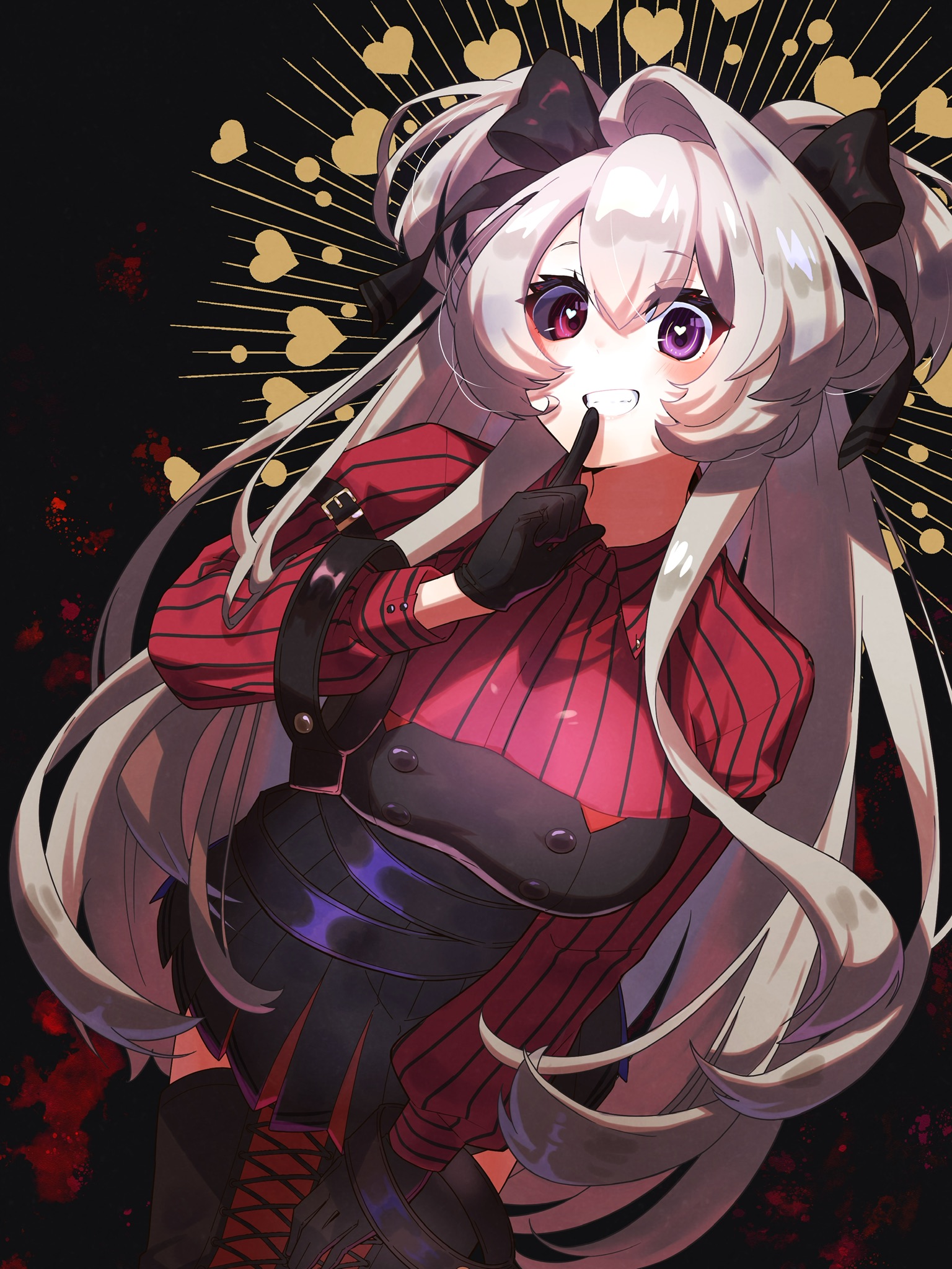 1girl alchemy_stars black_background black_boots black_gloves black_ribbon blush boots breasts dress eicy_(alchemy_stars) eyebrows_hidden_by_hair finger_to_mouth gloves grin hair_between_eyes hair_ribbon hand_on_own_knee heart heart_in_eye heterochromia highres lace-up_boots large_breasts leaning_forward long_hair looking_at_viewer open_mouth papaya_(lv4pa) purple_eyes red_dress red_eyes ribbon shushing smile solo striped_clothes striped_dress symbol_in_eye teeth thigh_boots twintails very_long_hair white_hair