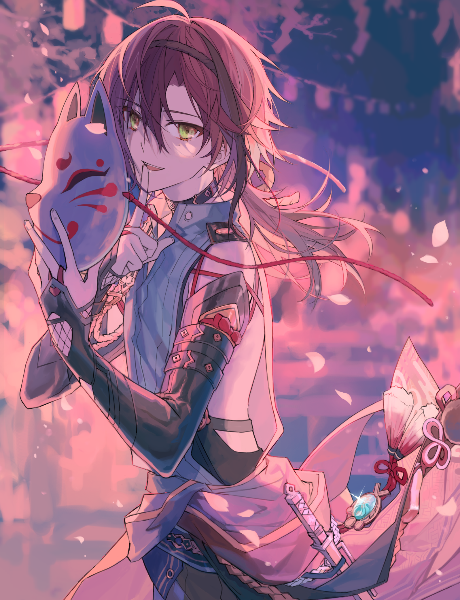 1boy 3244furika commentary falling_petals genshin_impact green_eyes hair_between_eyes highres holding holding_mask japanese_clothes mask mole mole_under_each_eye mole_under_eye multicolored_hair multiple_moles petals red_hair sheath sheathed shikanoin_heizou solo streaked_hair wind wind_lift