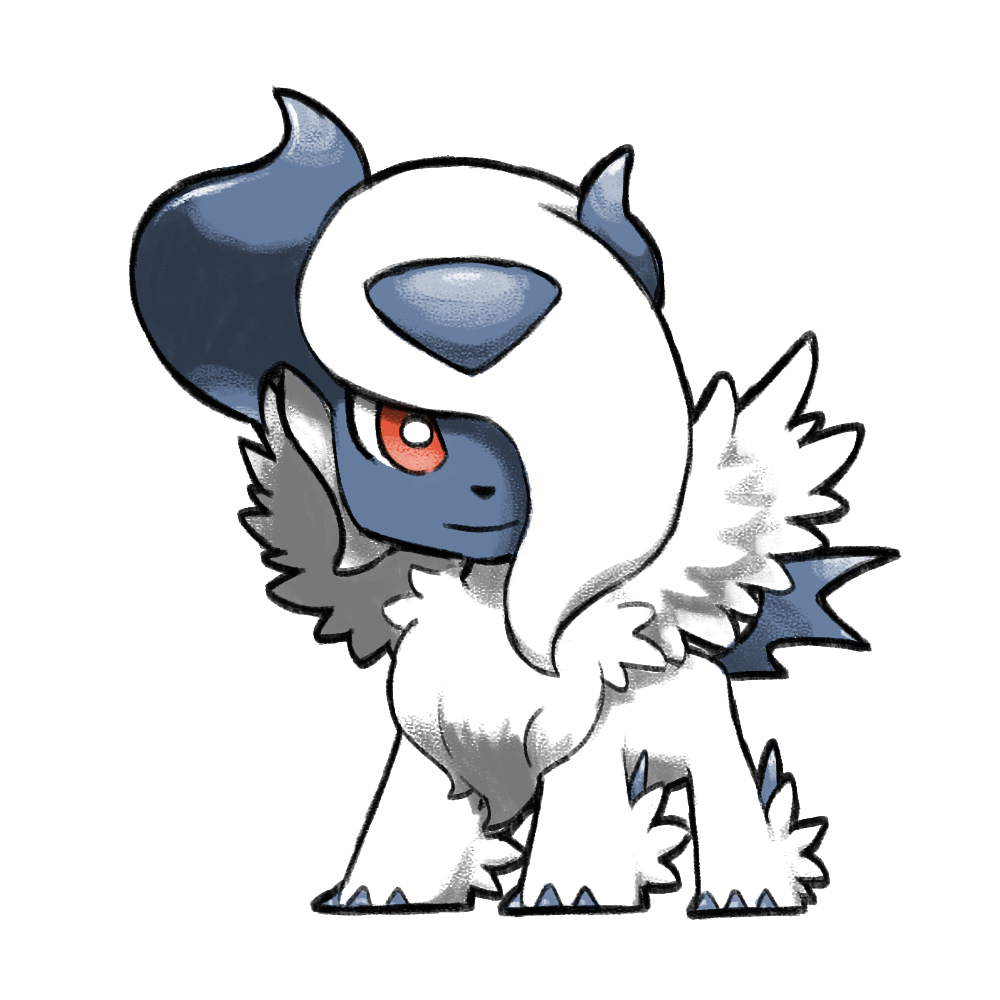 absol blacknirrow chibi closed_mouth full_body gen_3_pokemon hair_over_one_eye mega_absol mega_pokemon nintendo no_humans pokemon pokemon_(creature) pokemon_focus red_eyes simple_background smile solo white_background wings
