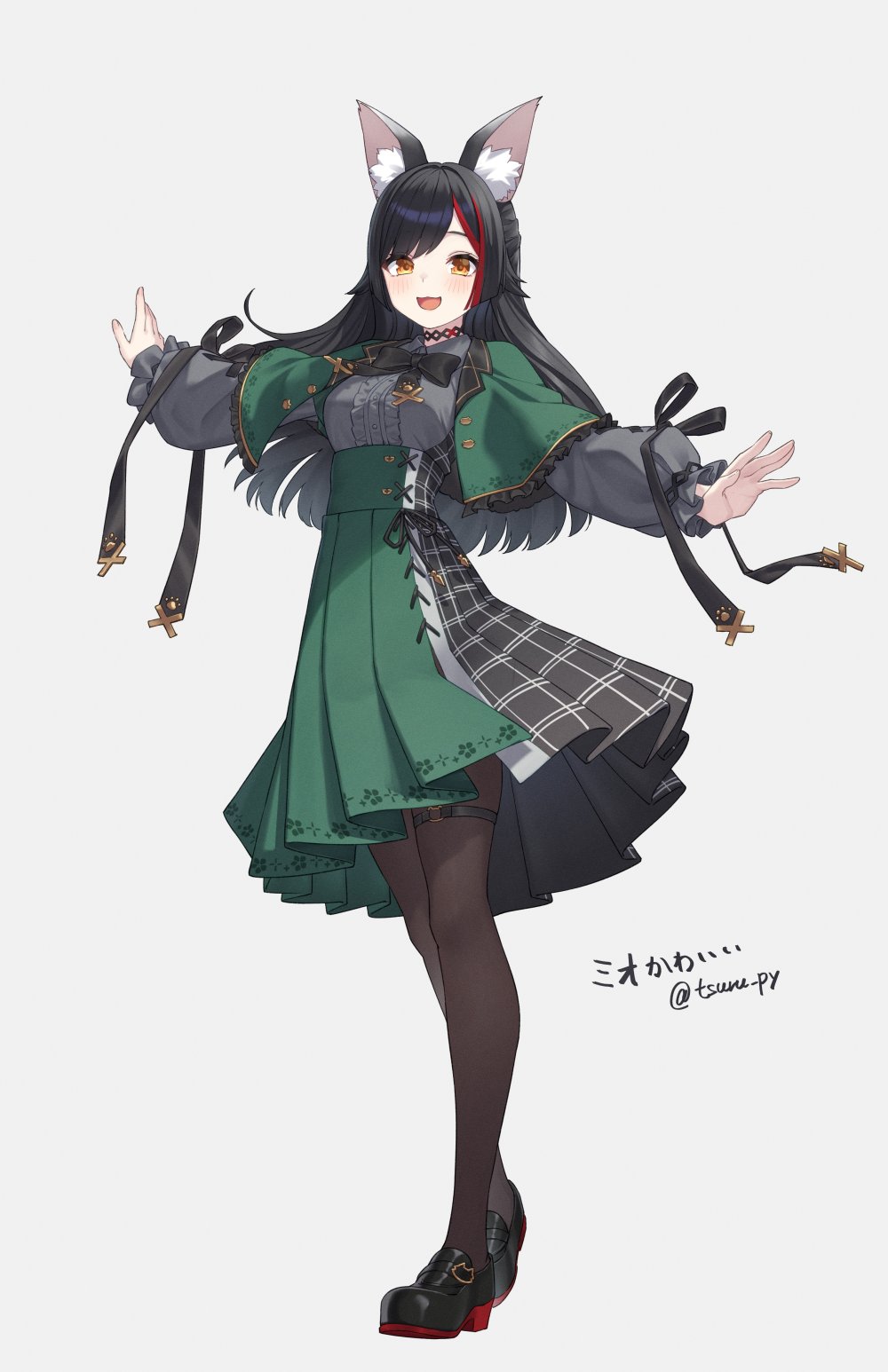 1girl animal_ear_fluff animal_ears black_bow black_bowtie black_hair black_pantyhose black_skirt bow bowtie capelet center_frills choker colored_shoe_soles corset cross-laced_clothes cross-laced_dress cross-laced_sleeves dress framed_breasts frilled_capelet frilled_sleeves frills full_body green_capelet grey_shirt high-waist_skirt highres hololive jirai_kei light_blush loafers long_hair long_sleeves looking_at_viewer medium_dress multicolored_hair official_alternate_costume official_alternate_hairstyle ookami_mio ookami_mio_(8th_costume) open_hand open_mouth outstretched_arms pantyhose plaid_clothes plaid_skirt pleated_skirt red_streaks shirt shoes signature simple_background skirt sleeve_ribbon smile solo standing streaked_hair swept_bangs t-pose tail tsurupy twitter_username two-tone_skirt virtual_youtuber white_background wolf_ears wolf_girl wolf_tail yellow_eyes
