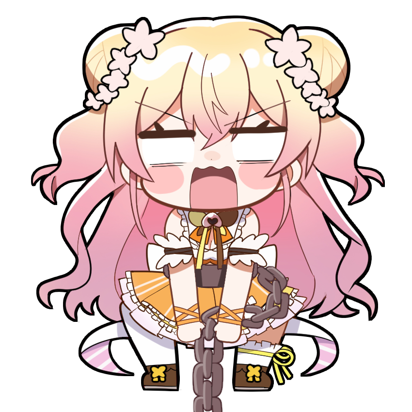 1girl asymmetrical_legwear blank_eyes blonde_hair blush_stickers boots brown_boots chibi chibi_only cleavage_cutout clothing_cutout double-parted_bangs double_bun flower frilled_shirt frilled_skirt frilled_socks frilled_thighhighs frills gradient_hair hair_bun hair_flower hair_ornament hololive layered_skirt long_hair miniskirt momosuzu_nene momosuzu_nene_(1st_costume) multicolored_hair nabe_(nabe_otome) orange_shirt orange_skirt pink_hair shirt side_up_bun single_sock single_thighhigh skirt sleeveless sleeveless_shirt socks solo thighhighs two_side_up uneven_legwear virtual_youtuber white_socks white_thighhighs yellow_skirt