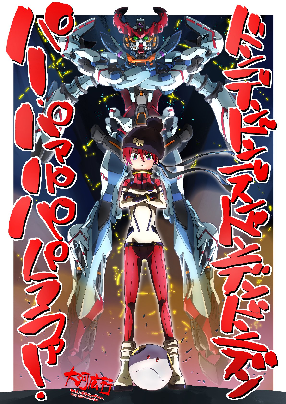 1girl amate_yuzuriha aqua_eyes bodysuit breasts closed_mouth creator_connection crossed_arms gainax glowing glowing_eyes gquuuuuux green_eyes gunbuster_pose gundam gundam_gquuuuuux haro hat headband highres looking_at_viewer mecha mecha_pilot_suit mobile_suit multicolored_bodysuit normal_suit_(gundam) red_hair robot science_fiction serious short_hair taiga_hiroyuki top_wo_nerae! top_wo_nerae!_(series) v-fin wind