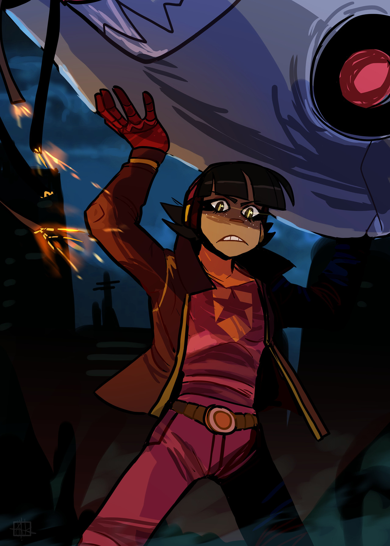1girl arms_up belt blunt_bangs bodysuit brown_belt brown_eyes brown_hair brown_jacket building cable city clenched_teeth commentary dark-skinned_female dark_skin english_commentary flat_chest flipped_hair gloves glowing helmet highres holding jacket long_sleeves looking_at_viewer night nose nuggnugget open_clothes open_jacket outdoors red_bodysuit red_eyes red_gloves red_helmet shaded_face short_hair signature solo sparks star_(symbol) star_print superhero_costume teeth wordgirl_(character) wordgirl_(series) yellow_pupils