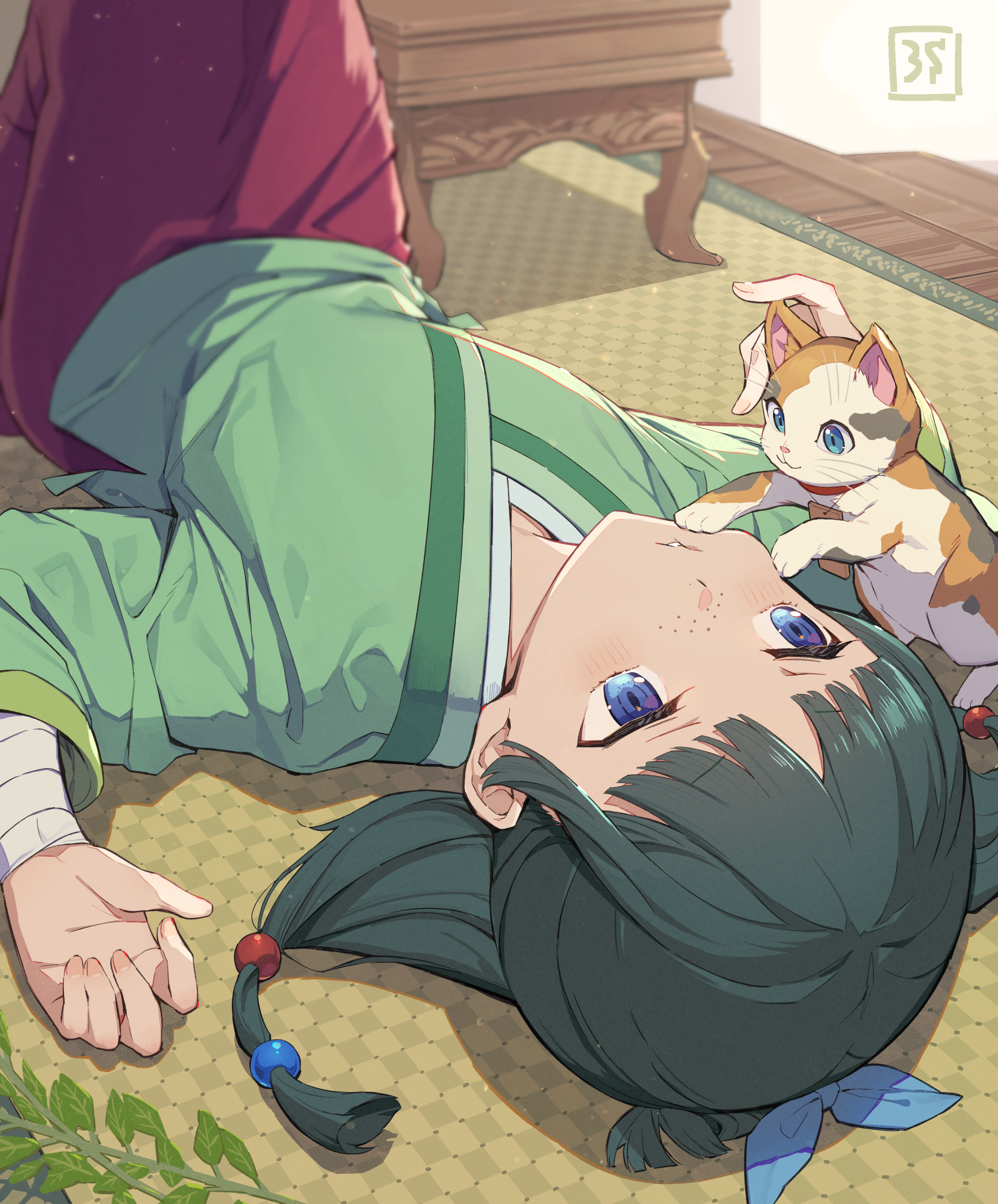 1girl 3s_(tarariko) absurdres aoqun beaded_hair_ornament blue_eyes calico_(pattern) calico_cat cat chinese_clothes commentary english_commentary flat_chest freckles green_hair green_shirt hanfu highres indoors kusuriya_no_hitorigoto leaf long_skirt lying maomao_(kusuriya_no_hitorigoto) on_back red_skirt shirt skirt solo table wooden_floor
