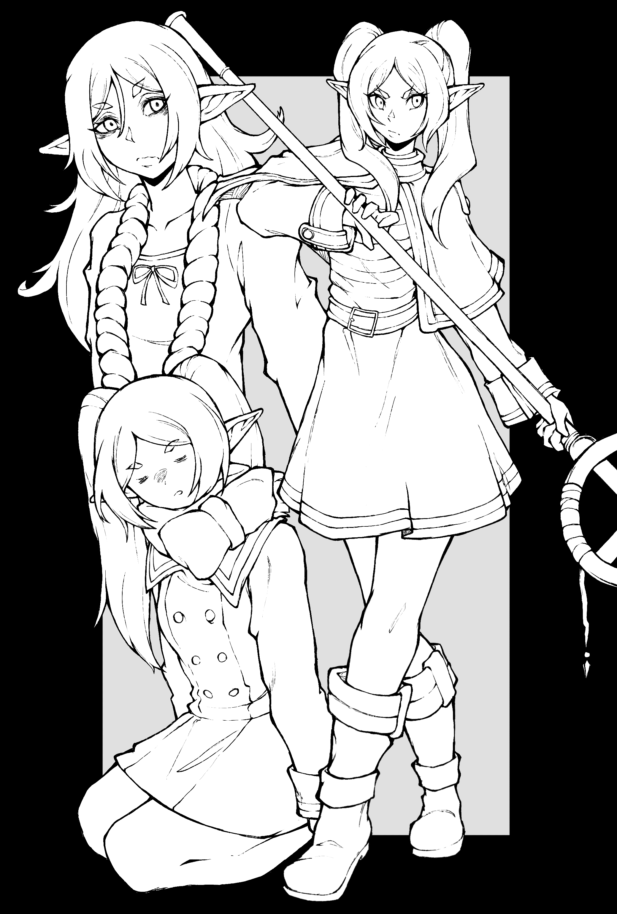 1girl absurdres bags_under_eyes boots capelet coat commentary earrings elf english_commentary frieren full_body greyscale highres holding holding_staff jewelry kekel long_hair mage_staff monochrome multiple_views pantyhose pointy_ears scarf seiza shirt sitting sleeping sousou_no_frieren staff striped_clothes striped_shirt teardrop_earrings twintails