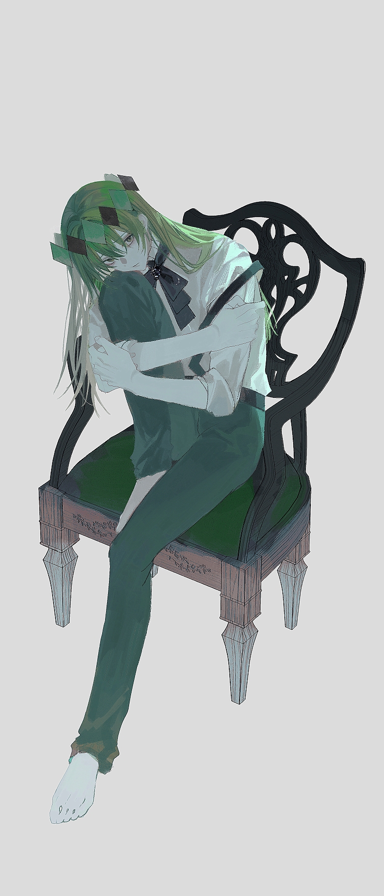 16personalities 1boy barefoot black_bow black_bowtie bow bowtie chair feitianxianyu green_eyes green_hair green_pants highres knee_up long_hair long_sleeves looking_at_viewer mediator_(16personalities) pants shirt simple_background sitting solo very_long_hair white_background white_shirt