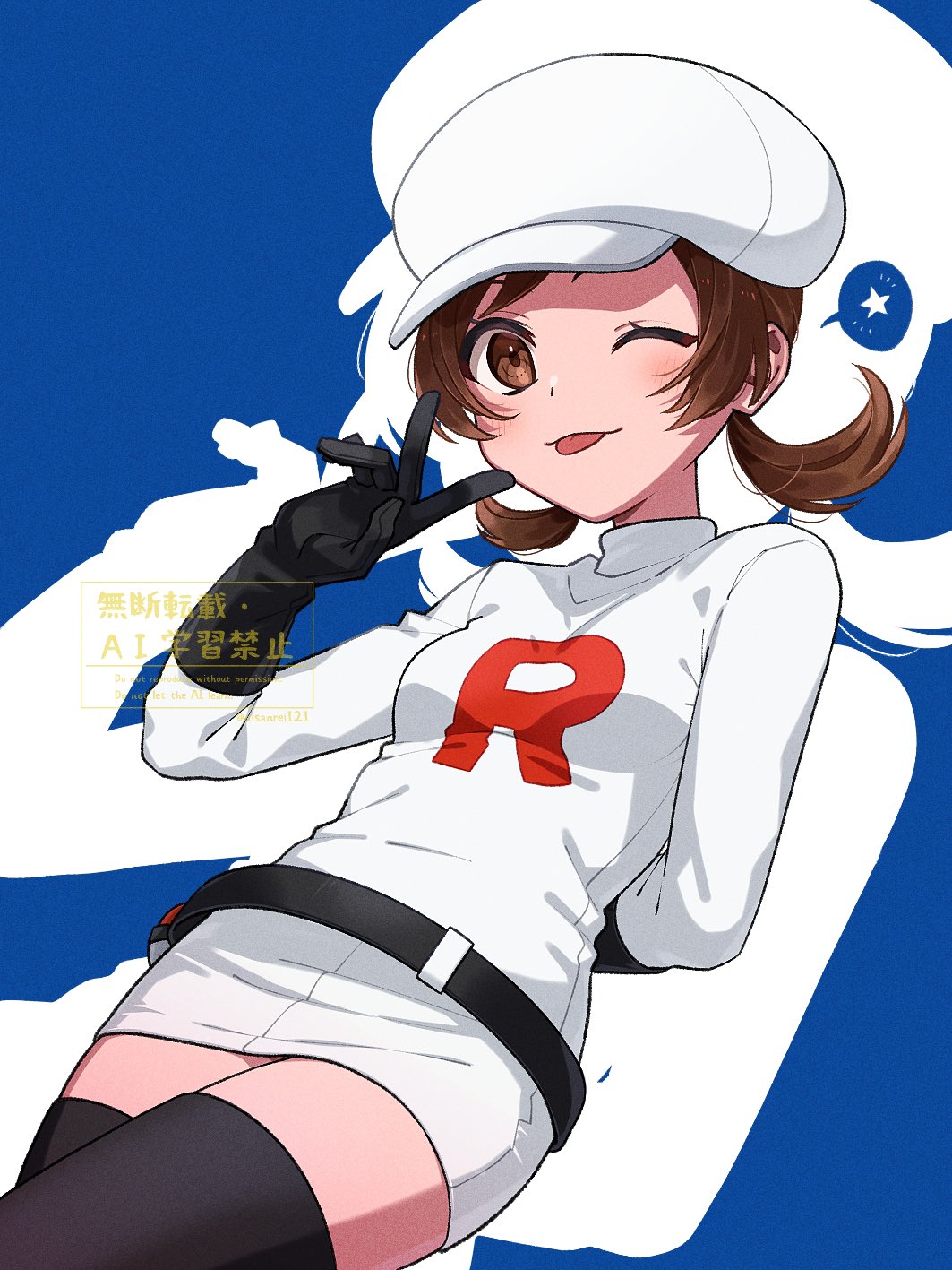 1girl :o arm_behind_back arm_up belt black_gloves black_thighhighs blue_background brown_eyes brown_hair commentary_request dress gloves hat highres loose_hair_strand low_twintails lyra_(pokemon) nintendo nisanrei121 one_eye_closed pencil_dress pokemon pokemon_masters_ex short_dress solo spoken_symbol star_(symbol) team_rocket team_rocket_uniform thighhighs twintails watermark white_dress white_hat