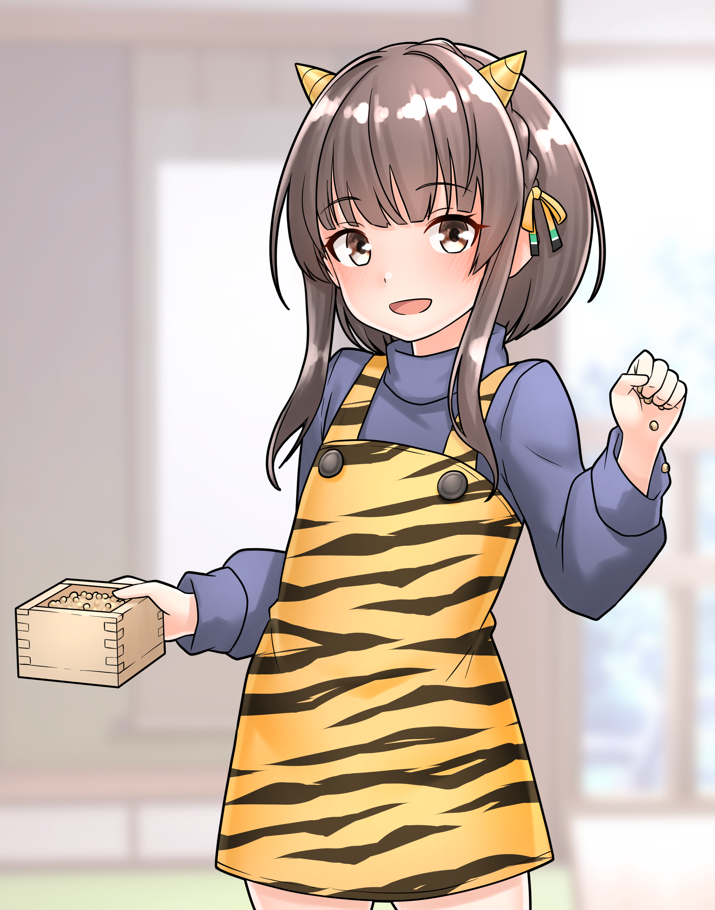 1girl absurdres animal_print apron blue_sweater brown_eyes commentary_request furaggu_(frag_0416) hair_ribbon hand_up highres indoors kantai_collection long_sleeves looking_at_viewer print_apron ribbon short_hair short_hair_with_long_locks solo standing sweater thighs tiger_print turtleneck turtleneck_sweater ukuru_(kancolle) yellow_ribbon
