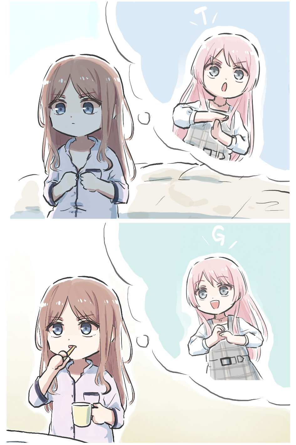 2girls bang_dream! bang_dream!_it's_mygo!!!!! blue_eyes brown_hair brushing_teeth chihaya_anon commentary cup dress grey_dress grey_eyes highres holding holding_cup jewelry long_hair lyy multiple_girls nagasaki_soyo necklace pajamas pinafore_dress pink_hair plaid_clothes plaid_dress shirt sidelocks sleeveless sleeveless_dress togawa_group_(bang_dream!) white_shirt