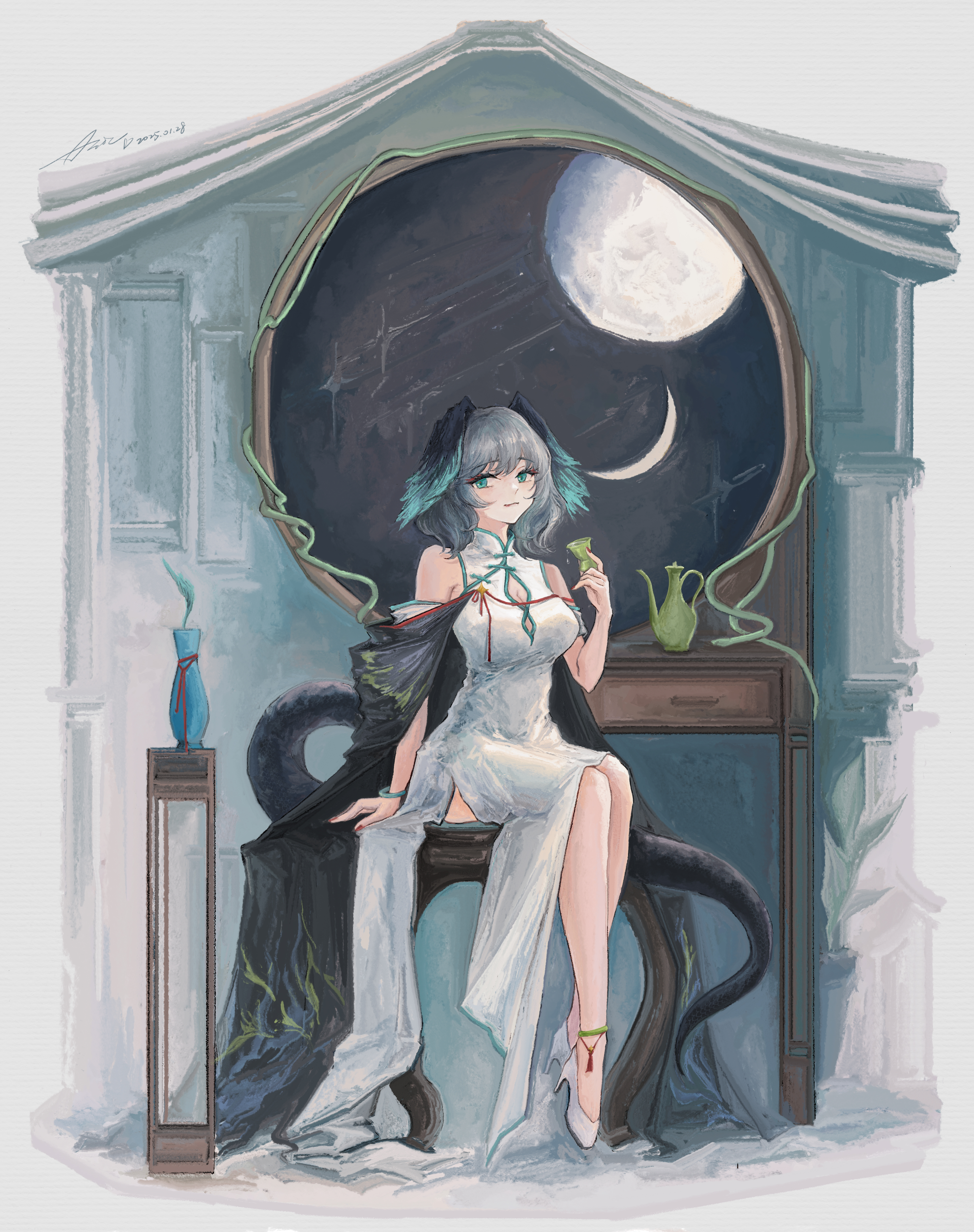 1girl absurdres alternate_costume aqua_eyes arknights asic_(2595268715) bare_shoulders black_cape cape china_dress chinese_clothes cup dress feathered_wings full_body full_moon grey_hair hair_between_eyes hand_up head_wings highres ho'olheyak_(arknights) holding holding_cup looking_at_viewer moon sitting snake_tail solo tail vase very_long_tail white_dress window wings