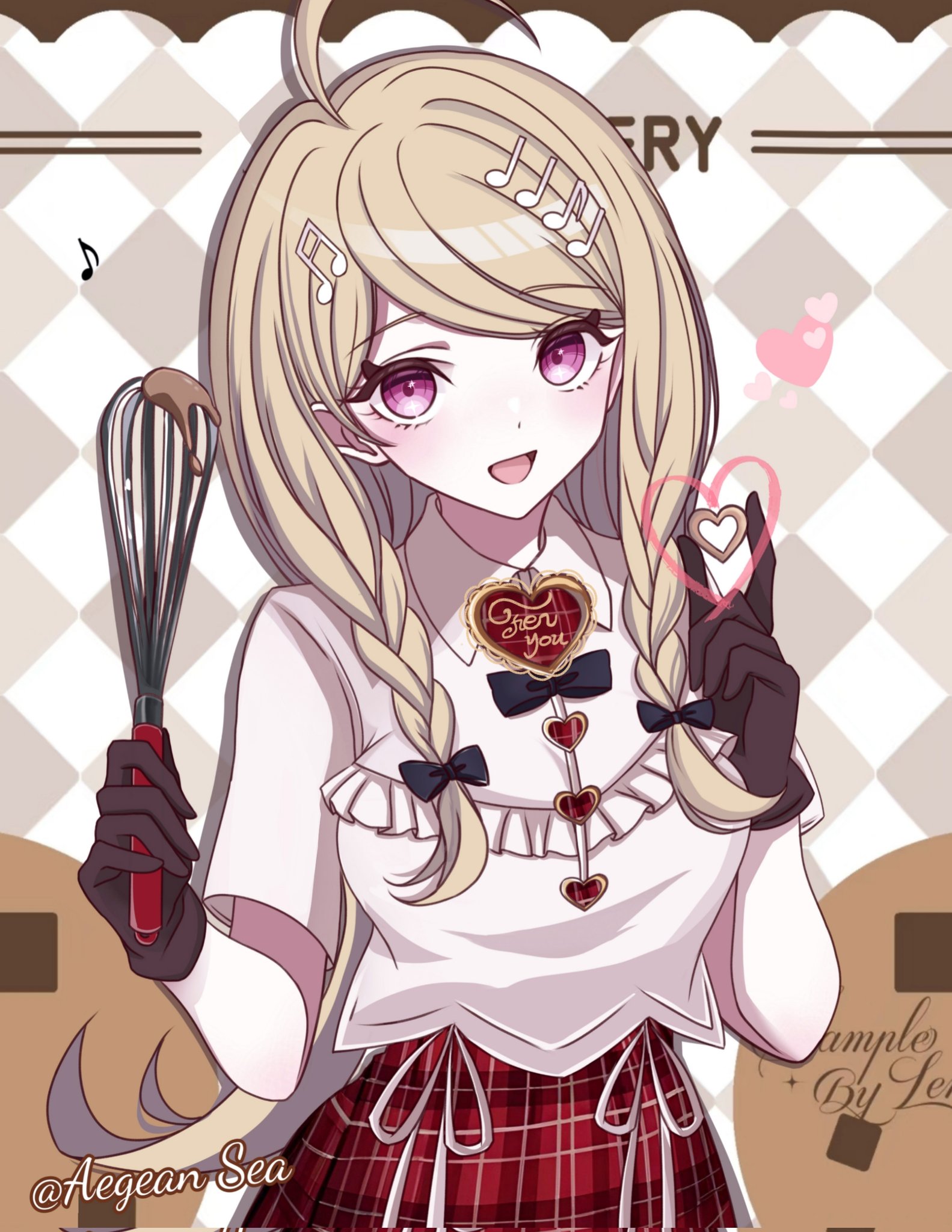 1girl :d aegean_sea ahoge akamatsu_kaede black_bow black_bowtie blonde_hair bow bowtie braid cowboy_shot danganronpa_(series) danganronpa_v3:_killing_harmony fortissimo hair_bow hair_ornament hands_up heart highres holding holding_heart long_hair musical_note musical_note_hair_ornament open_mouth pink_eyes plaid_clothes plaid_skirt red_skirt shirt skirt smile solo twin_braids