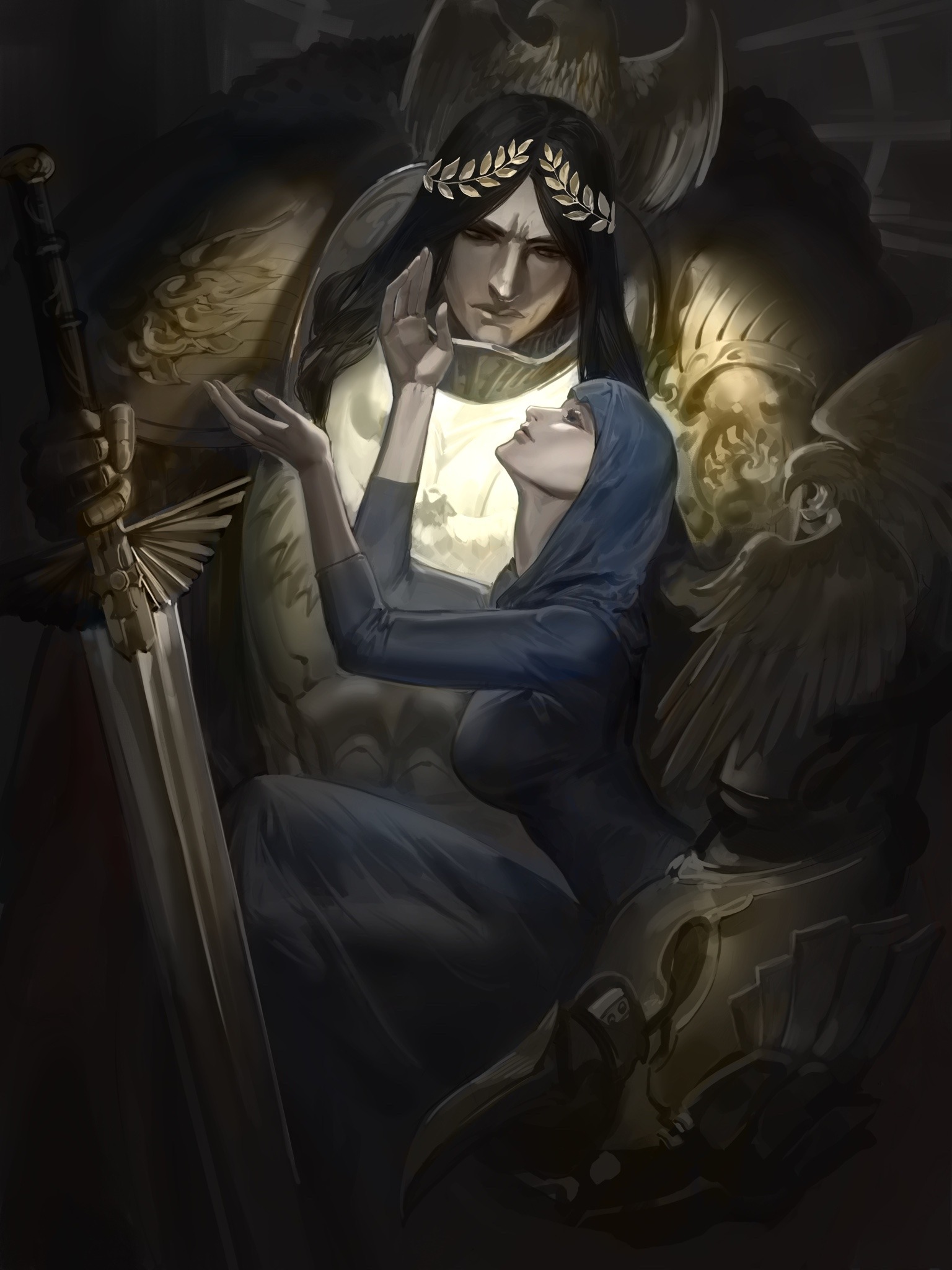 1boy 1girl armor black_hair blue_dress breastplate breasts carrying carrying_person clawed_gauntlets commentary dress emperor's_sword emperor_of_mankind english_commentary erda_(warhammer_40k) fangtangtang2333 gauntlets gold gold_armor highres holding holding_sword holding_weapon husband_and_wife imperial_aquila large_breasts laurel_crown laurels light_smile long_hair ornate_armor pauldrons power_armor shoulder_armor single_gauntlet sword warhammer_40k weapon