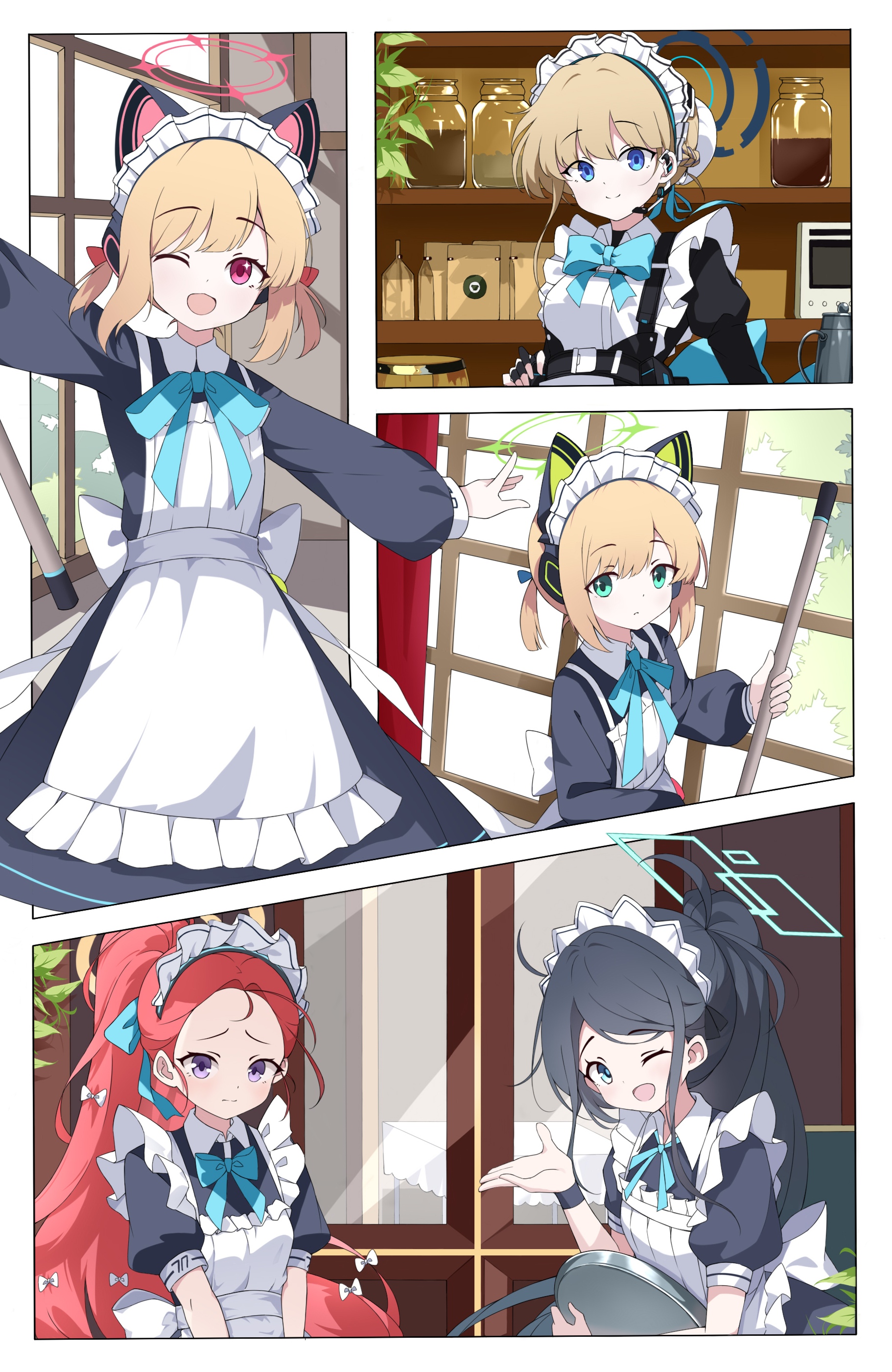 absurdres apron aris_(blue_archive) aris_(maid)_(blue_archive) black_hair blonde_hair blue_archive blue_eyes game_development_department_(blue_archive) green_eyes highres maid_apron maid_headdress midori_(blue_archive) midori_(maid)_(blue_archive) momoi_(blue_archive) momoi_(maid)_(blue_archive) official_alternate_costume official_alternate_hairstyle one_eye_closed pink_eyes ponytail purple_eyes red_hair toki_(blue_archive) xianyu_(pixiv9677779) yuzu_(blue_archive) yuzu_(maid)_(blue_archive)