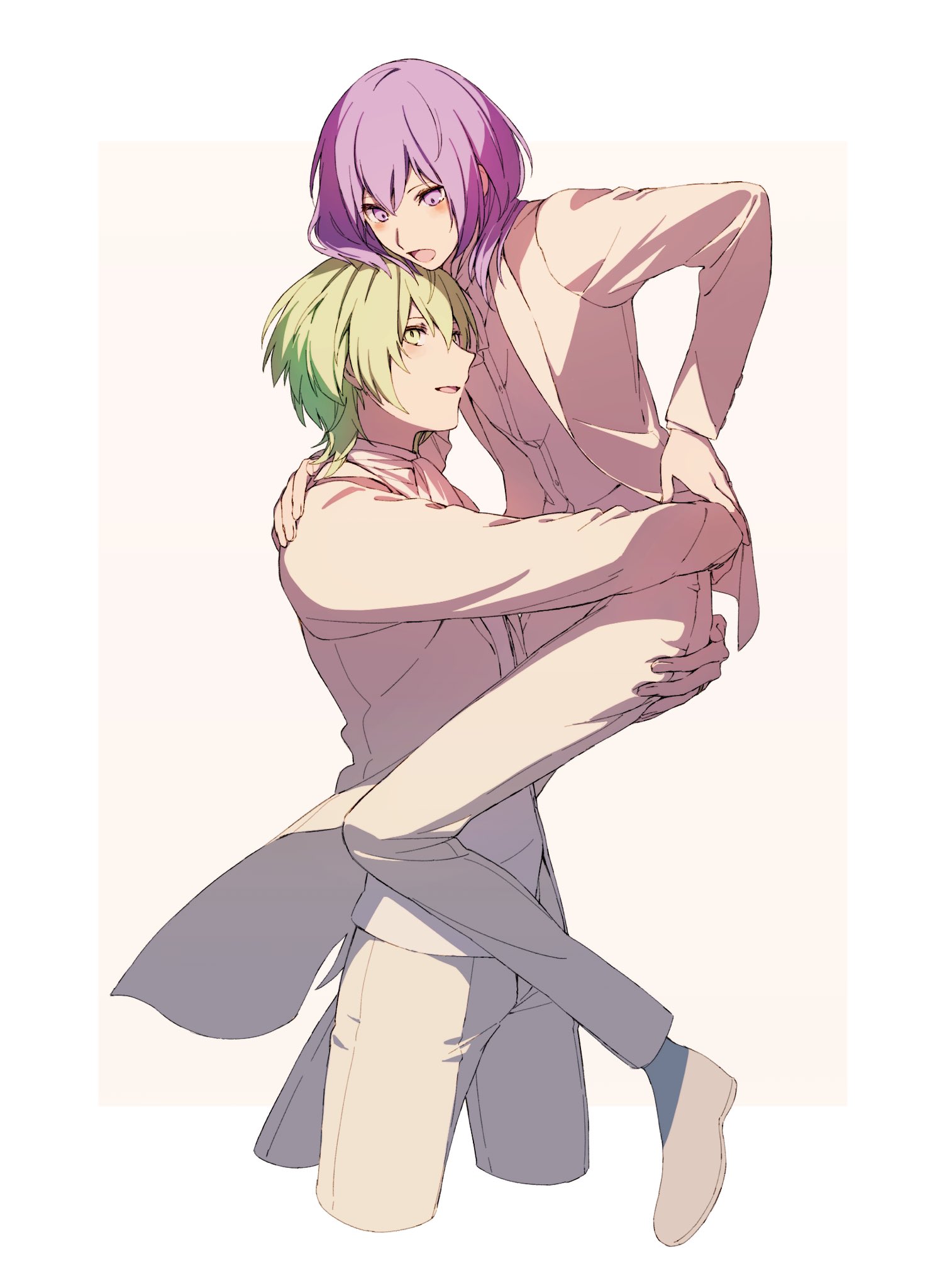 blush male_byleth_(awakened)_(fire_emblem) male_byleth_(fire_emblem) commentary_request cropped_legs fire_emblem fire_emblem:_three_houses formal_clothes green_eyes green_hair hand_on_another's_shoulder highres holding iwasinogomaae jacket lapels long_sleeves looking_at_another nintendo open_clothes open_jacket open_mouth pants purple_hair suit suit_jacket white_footwear white_jacket white_pants white_suit wolf_cut yuri_leclerc