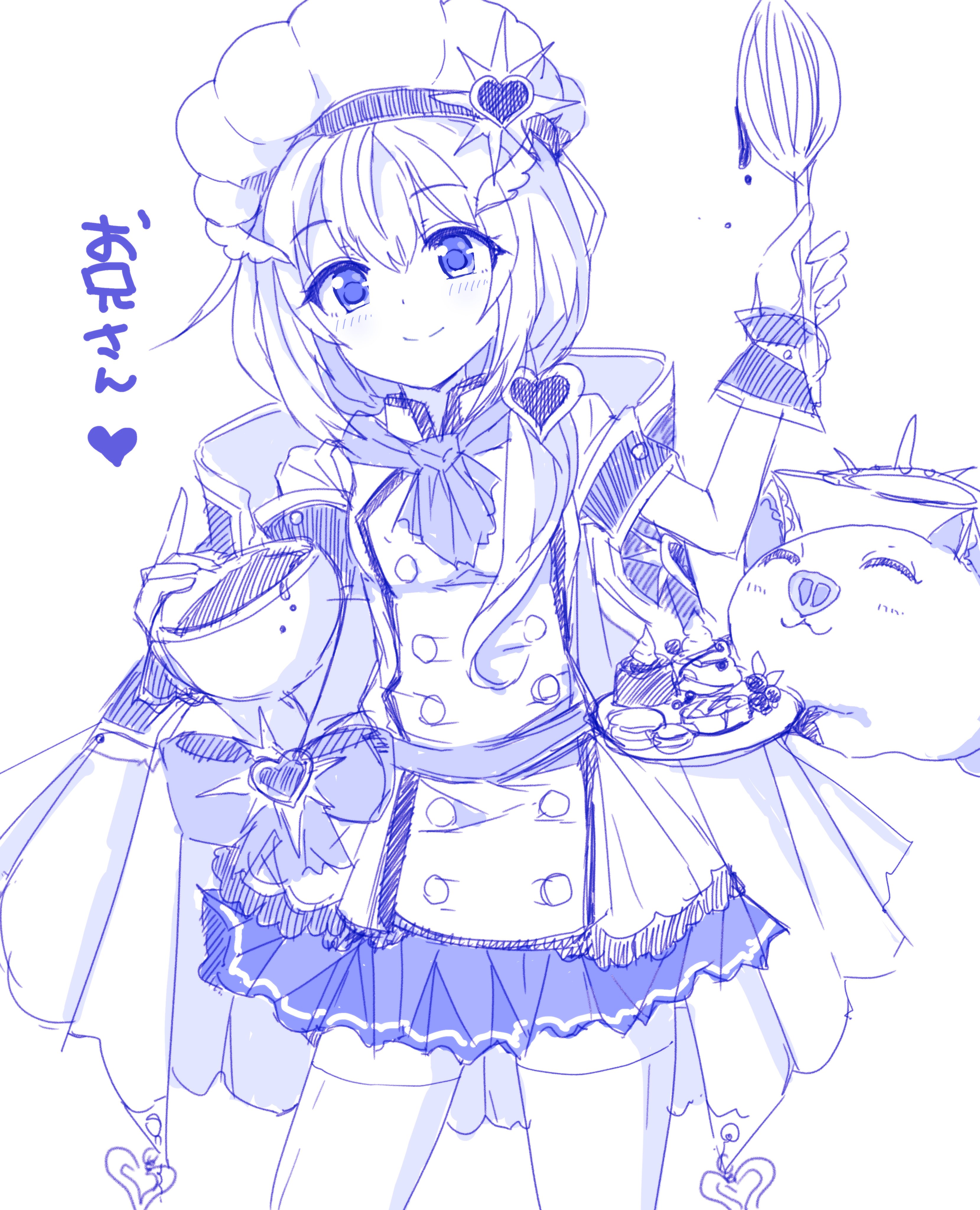 1girl absurdres blue_theme blush bowl buttons chocolate_making clear_(princess_connect!) closed_mouth cosplay cowboy_shot detached_sleeves double-breasted hat heart highres holding holding_bowl holding_whisk jacket looking_at_viewer low_side_ponytail miniskirt mixing_bowl monochrome neckerchief pig pleated_skirt princess_connect! shizuru_(princess_connect!) shizuru_(princess_connect!)_(cosplay) shizuru_(valentine)_(princess_connect!) short-sleeved_jacket short_sleeves side_ponytail simple_background skirt smile solo split_mouth thighhighs translation_request whisk white_background yamada_(hvcij) zettai_ryouiki