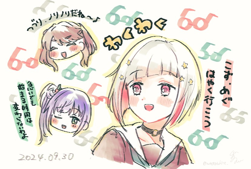 3girls :d ;d ^_^ aqua_neckerchief black_choker blush bob_cut brown_dress brown_hair chibi chibi_inset choker closed_eyes colored_inner_hair commentary_request cropped_shoulders dated diagonal_bangs dress flower fujishima_megumi glasses green_eyes grey_hair hair_bun hair_flower hair_ornament hasu_no_sora_school_uniform head_only inverted_bob link!_like!_love_live! long_hair love_live! multicolored_hair multiple_girls neckerchief o-ring o-ring_choker one_eye_closed open_mouth otomune_kozue outline purple_hair red_eyes red_flower red_hair sailor_collar sailor_dress school_uniform short_hair side_ponytail sidelocks single_side_bun smile star_(symbol) star_hair_ornament streaked_hair teeth two_side_up upper_teeth_only virtual_youtuber white_(waterwhite) white_background white_sailor_collar winter_uniform yellow_outline yugiri_tsuzuri