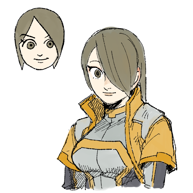 1girl bodysuit breasts brown_eyes brown_hair dancho_no_mori eyelashes grey_bodysuit hair_over_one_eye high_collar humanization jacket light_smile looking_at_viewer mii_(nintendo) mii_gunner mii_gunner_(smash_ultimate) nintendo open_clothes open_jacket portrait reference_inset short_sleeves solo super_smash_bros. white_background wide-eyed yellow_jacket