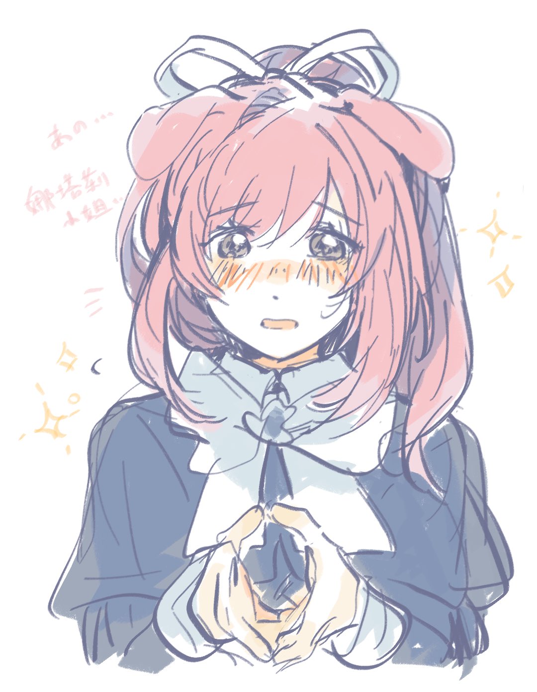 1girl animal_ears black_dress blush bow bowtie brown_eyes circle_hands diana_(akutsuka) dog_ears dress embarrassed flying_sweatdrops genkai_ol-san_wa_akuyaku_reijou-sama_ni_tsukaetai hair_ribbon highres kemonomimi_mode long_sleeves medium_hair nose_blush notice_lines open_mouth red_hair ribbon simple_background solo sparkle swept_bangs translation_request upper_body white_background white_bow white_bowtie white_ribbon woodonly