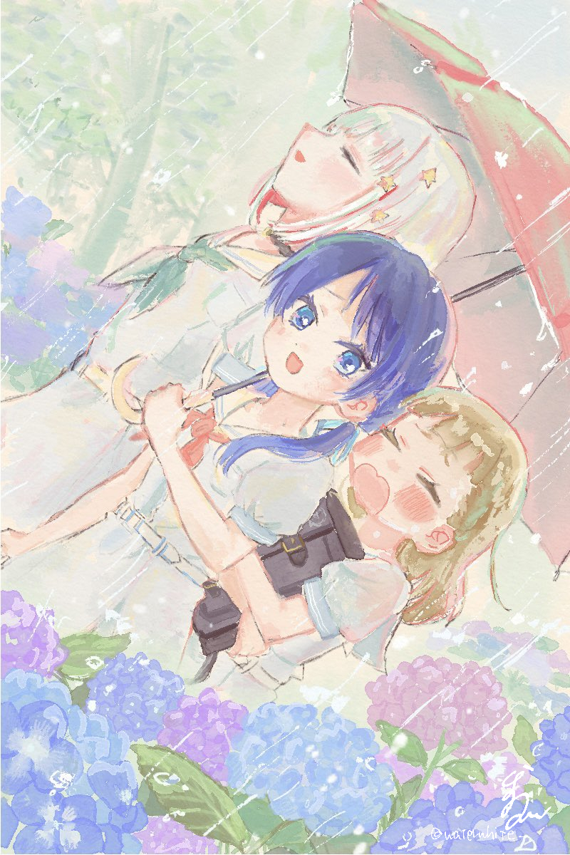 3girls :d bag blue_eyes blue_flower blue_hair blue_ribbon blunt_bangs blush braid brown_hair carrying closed_eyes commentary_request dollchestra dress dutch_angle flower green_neckerchief hair_ribbon hasu_no_sora_school_uniform highres holding holding_umbrella hydrangea kachimachi_kosuzu link!_like!_love_live! long_hair love_live! low_twintails mole mole_on_neck multiple_girls murano_sayaka neckerchief open_mouth purple_flower rain red_neckerchief red_umbrella ribbon sailor_collar sailor_dress school_bag school_uniform short_sleeves side_ahoge side_braids smile summer_uniform twintails umbrella virtual_youtuber white_(waterwhite) white_dress white_sailor_collar yugiri_tsuzuri