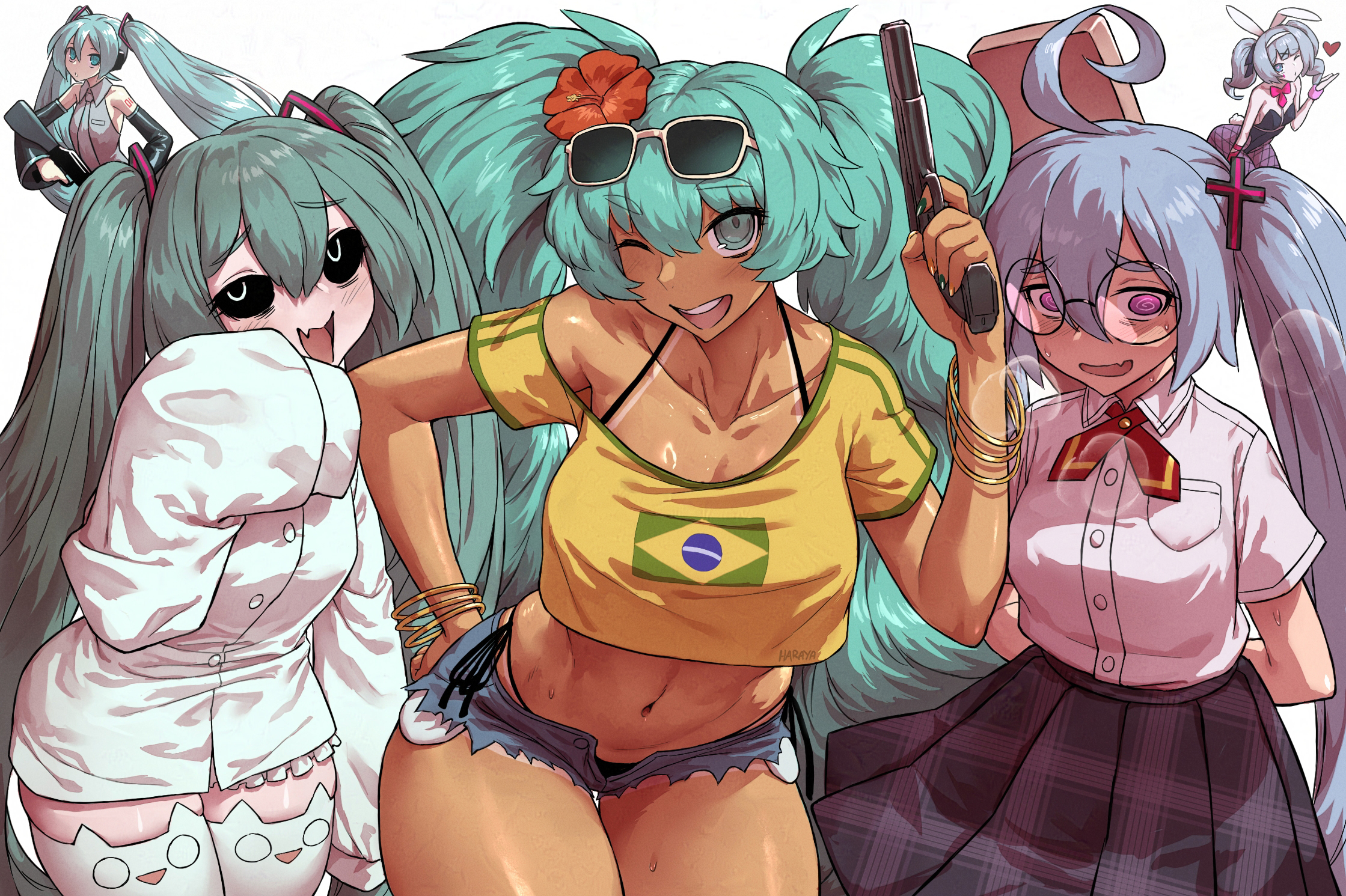 5girls @_@ alternate_breast_size_(larger) animal_ear_legwear animal_ears antenna_hair aqua_eyes aqua_hair aqua_necktie black_sclera black_sleeves borrowed_clothes bracelet brazilian_flag brazilian_flag_print brazilian_miku cat_ear_legwear coke-bottle_glasses colored_sclera confessions_of_a_rotten_girl_(vocaloid) cross_hair_ornament drooling exposed_pocket eyewear_on_head fake_animal_ears fang flag_print glasses grey_shirt gun hair_ornament haraya_manawari hatsune_miku headphones highres holding holding_gun holding_weapon jewelry long_hair looking_at_viewer mesugaki mimukauwa_nice_try_(vocaloid) mouth_drool multiple_bracelets multiple_girls multiple_persona necktie open_mouth pink_pupils playboy_bunny purple_eyes rabbit_hole_(vocaloid) school_uniform shirt simple_background skin_fang smile sunglasses tan tanline tanline_peek thick_thighs thighs twintails very_long_hair vocaloid weapon white_background white_shirt