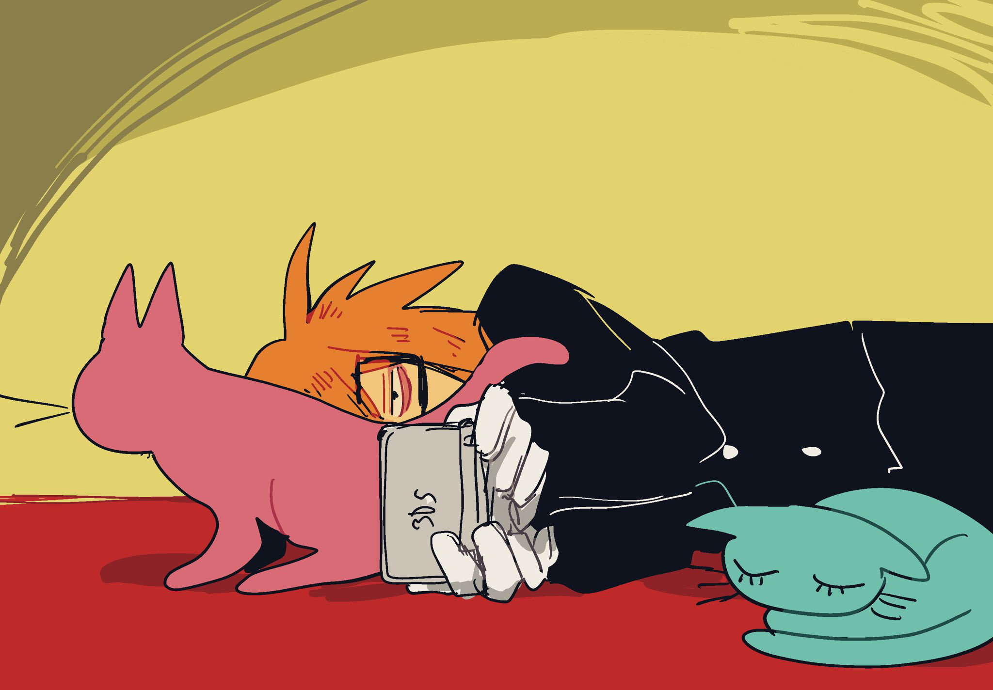 1boy animal animalization black_eyes black_jacket cat commentary_request gloves handheld_game_console highres jacket lying male_focus nintendo_3ds nyen_(randal's_friends) nyon_(randal's_friends) on_side orange_hair playing_games playing_video_games pomepom285685 randal's_friends randal_ivory solo yellow_background