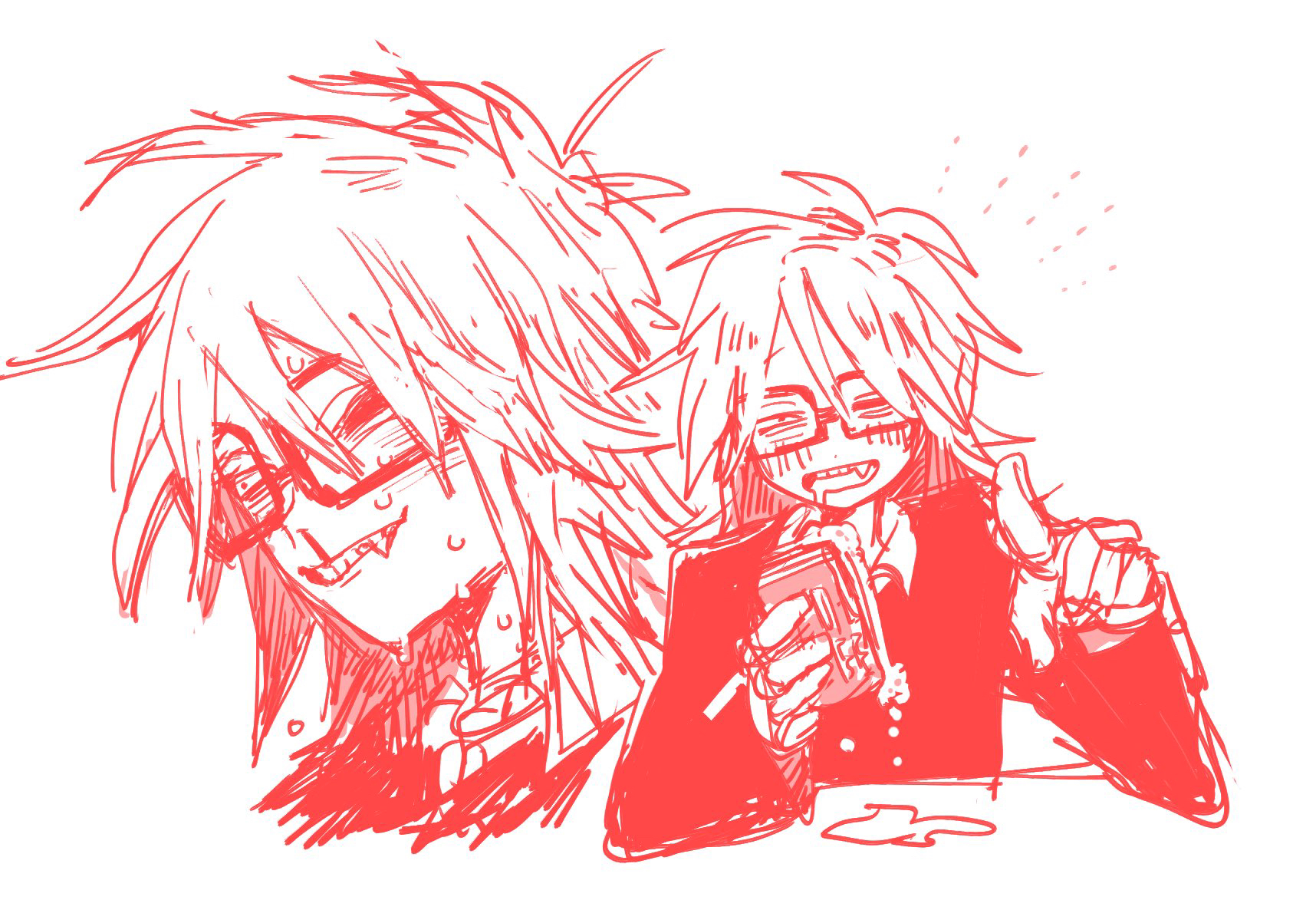 1boy blood commentary_request drooling fang glasses highres holding long_hair male_focus mouth_drool multiple_views nosebleed one_eye_closed pointing pointing_at_viewer pomepom285685 randal's_friends randal_ivory red_theme simple_background sweat white_background