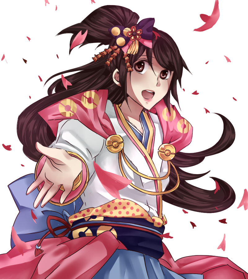 brown_eyes brown_hair hair_ribbon japanese_clothes kimono lips lipstick long_hair looking_at_viewer makeup nintendo obi oichi_(pokemon_conquest) oichi_(sengoku_musou) petals pokemon pokemon_conquest ponytail reaching reaching_towards_viewer ribbon sash sengoku_musou smile