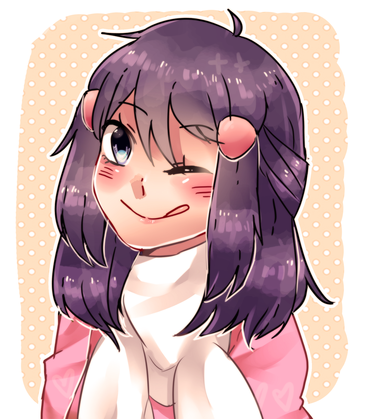 1girl ahoge blush dawn_(pokemon) hair_ornament hairclip highres looking_at_viewer nintendo one_eye_closed orange_background outline pokemon pokemon_diamond/pearl/platinum pokemon_platinum scarf smile solo tongue tongue_out white_outline white_scarf zenika_(josubae)