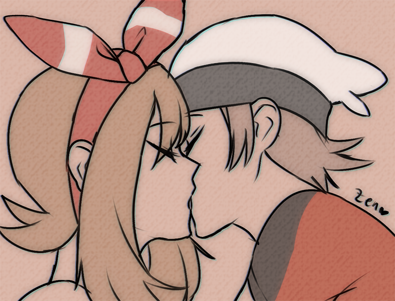 1boy 1girl beanie bow_hairband brendan_(pokemon) brown_hair closed_eyes hairband hat hetero kiss may_(pokemon) nintendo pokemon pokemon_omega_ruby_and_alpha_sapphire signature upper_body zenika_(josubae)