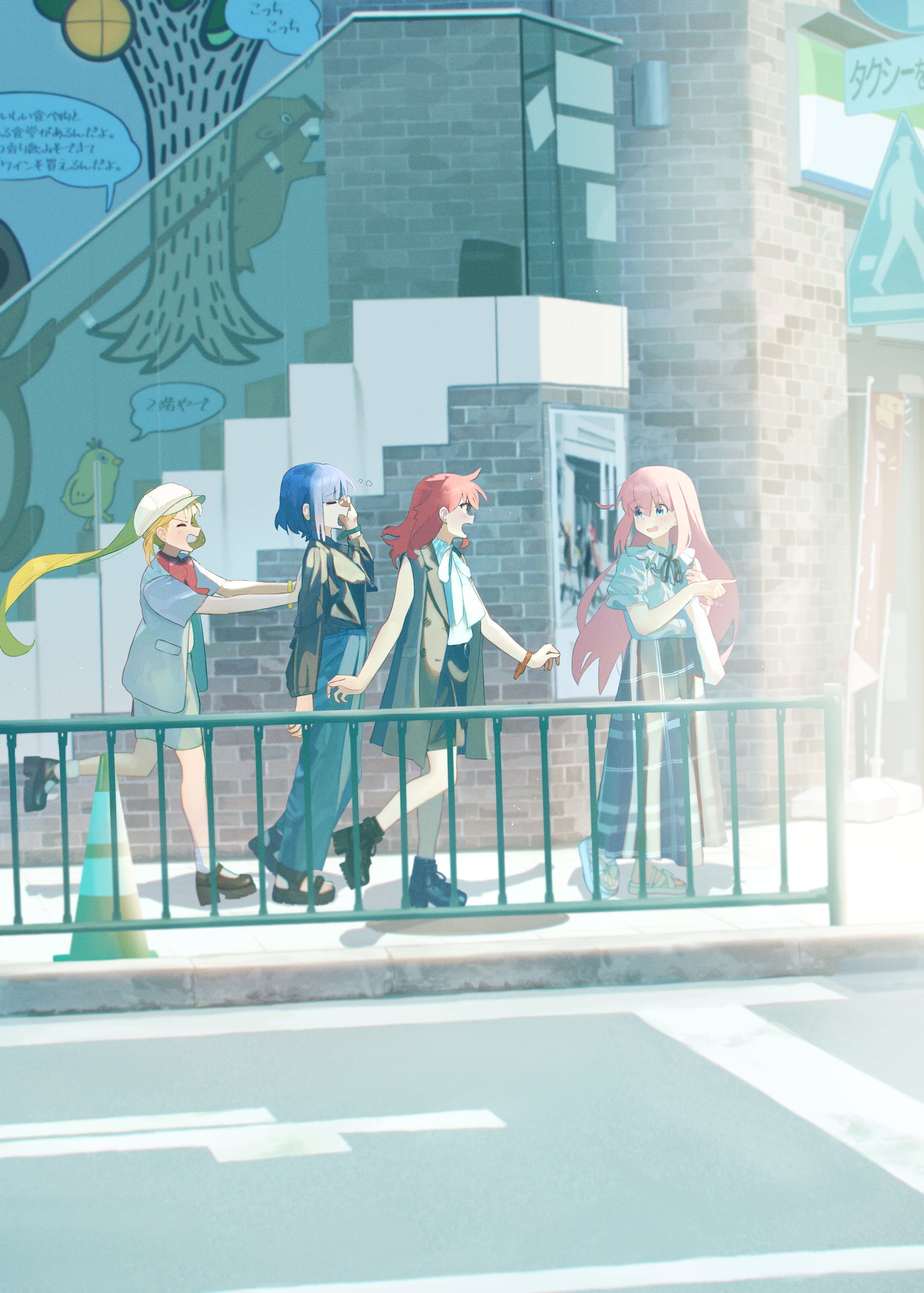 4girls absurdres alternate_costume ankle_socks black_footwear black_shirt black_skirt blonde_hair blue_hair blue_pants blush bocchi_the_rock! bow bowtie cable_tie_around_wrist city closed_eyes day frilled_shirt_collar frills from_side full_body gotoh_hitori grey_jacket grey_skirt hair_between_eyes hat highres ijichi_nijika jacket kessoku_band kita_ikuyo long_hair long_skirt long_sleeves looking_at_another medium_hair multiple_girls mural one_side_up open_clothes open_jacket open_mouth outdoors pants pink_hair platform_footwear puffy_short_sleeves puffy_sleeves railing red_bow red_bowtie red_hair road road_sign sandals shirasuke_0822 shirt shoes short_sleeves side_ponytail sidelocks sidewalk sign skirt sleeveless sleeveless_jacket sleeveless_shirt socks squeans stairs traffic_cone very_long_hair walking white_footwear white_hat white_shirt yamada_ryo