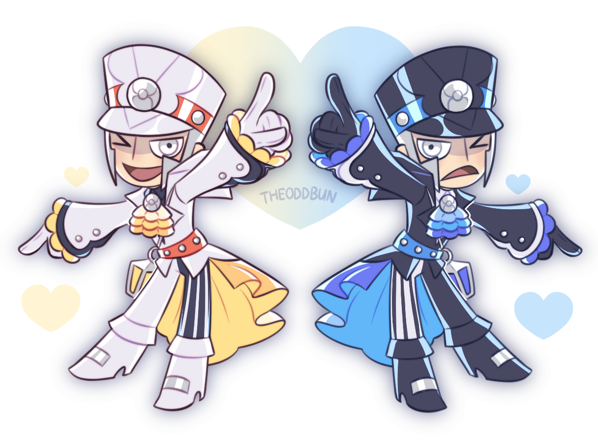2boys ascot black_footwear black_gloves black_hat blue_ascot brothers deformed emmet_(pokemon) emmet_(sygna_suit)_(pokemon) full_body gloves grey_eyes grey_hair hat heart ingo_(pokemon) ingo_(sygna_suit)_(pokemon) male_focus multiple_boys nintendo official_alternate_costume one_eye_closed pokemon pokemon_masters_ex siblings sideburns theoddbun twins white_footwear white_gloves white_hat yellow_ascot