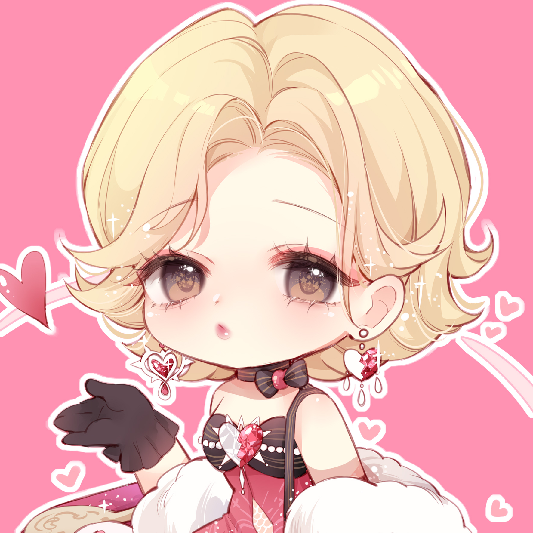 1girl bag bare_shoulders black_bow black_bowtie black_choker black_gloves blonde_hair blowing_kiss bow bow_choker bowtie brown_eyes chest_jewel chibi choker clothing_cutout diamond_cutout dreamy_glimmer_(infinity_nikki) dress earrings eyelashes eyeshadow frilled_gloves frills fur_shawl gem gloves hand_up heart heart-shaped_gem heart_choker heart_earrings highres infinity_nikki jewelry lipstick makeup mismatched_eyebrows nikki_(series) nuli_de_chengzhi_er outline parted_lips pink_background pink_eyeshadow pink_lips red_dress red_gem shawl short_hair shoulder_bag simple_background sitting solo sparkle spikes stomach_cutout strapless strapless_dress striped_bow striped_bowtie striped_choker striped_clothes upper_body white_gem white_outline white_shawl