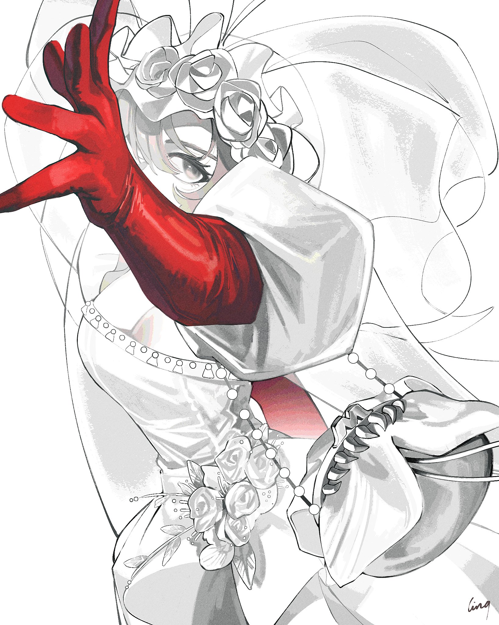 1girl artist_name bag breasts brown_eyes brown_hair cleavage dress elbow_gloves flower gloves hair_flower hair_ornament handbag highres ling_(chaaaaanhikari) medium_breasts melania_(a_peaceful_night)_(reverse:1999) melania_(reverse:1999) ms._acey official_alternate_costume outstretched_arm puffy_short_sleeves puffy_sleeves red_gloves reverse:1999 rose short_sleeves signature solo upper_body veil wedding_dress white_background white_bag white_flower white_rose white_veil