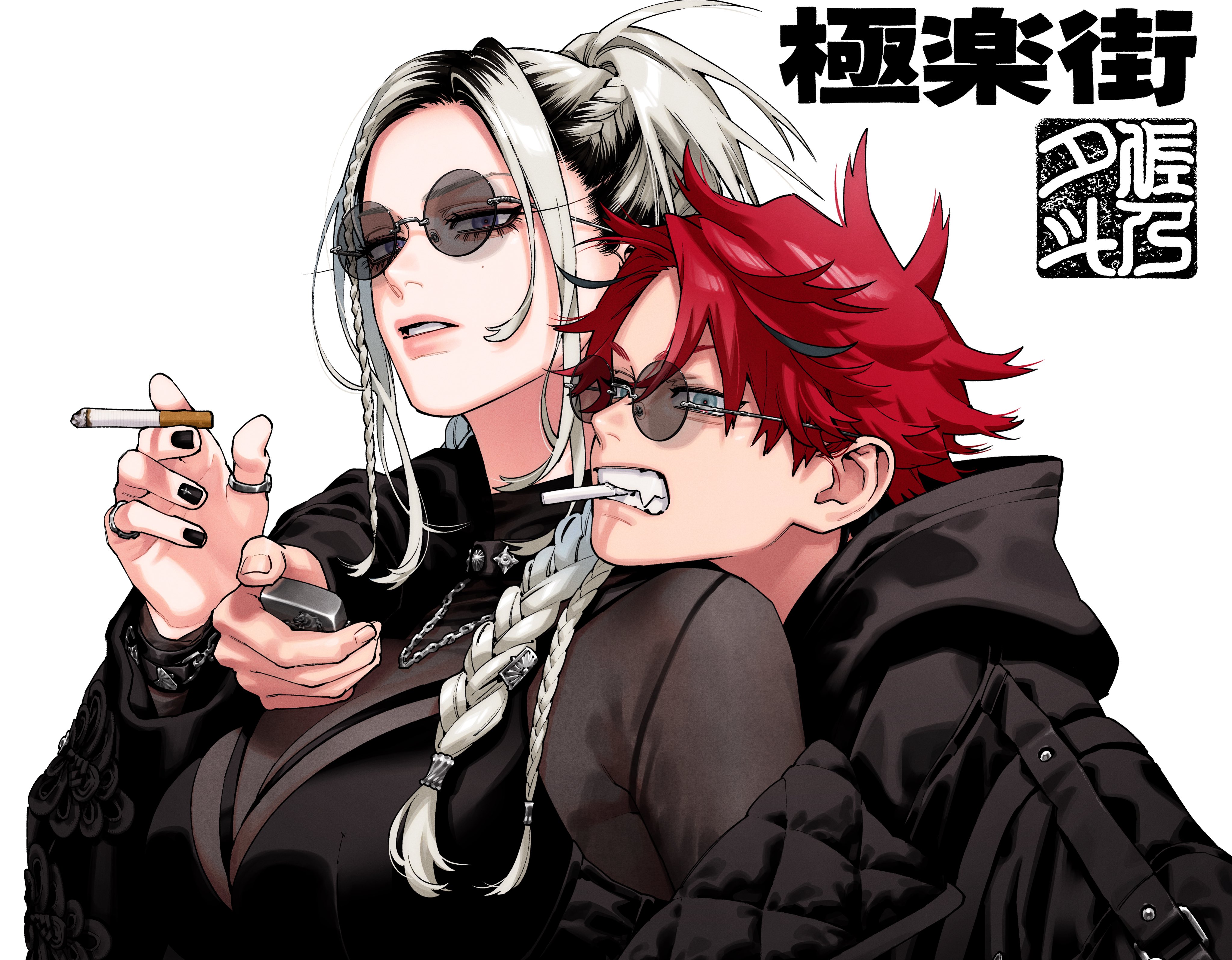1boy 1girl absurdres alma_(gokurakugai) arm_around_shoulder black_hoodie black_jacket black_nails black_shirt blue_eyes braid braided_sidelock breasts cigarette clenched_teeth commentary copyright_name expressionless eyelashes fingernails forehead gokurakugai grey_eyes hand_up head_on_another's_shoulder hetero highres holding holding_cigarette holding_lighter hood hoodie jacket jewelry large_breasts leaning_on_person lighter long_hair long_sleeves looking_at_viewer messy_hair multicolored_hair multiple_rings nail_polish parted_lips pink_lips ponytail red_hair ring roots_(hair) sano_yuuto shirt short_hair simple_background smoking sunglasses untranslatable_commentary tao_(gokurakugai) teeth upper_body white_background white_hair