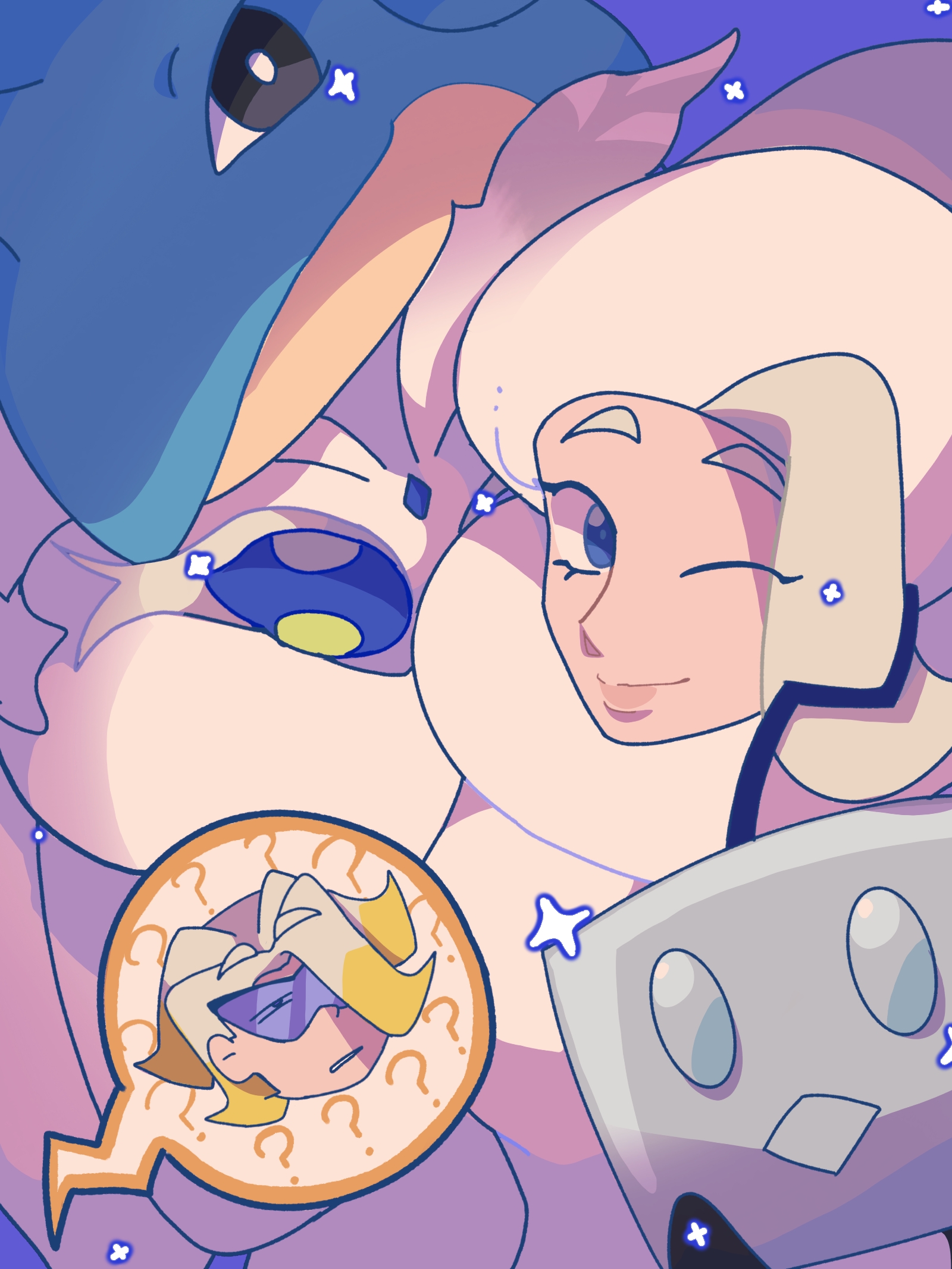 1girl ;) blue_eyes closed_mouth commentary_request eiscue eiscue_(ice) eyelashes frosmoth gen_1_pokemon gen_8_pokemon gordie_(pokemon) hat highres lapras looking_at_viewer melony_(pokemon) nintendo one_eye_closed pokemon pokemon_(creature) pokemon_sword_and_shield scarf shirt smile sparkle white_hat white_scarf white_shirt wind_(nxpu3447)
