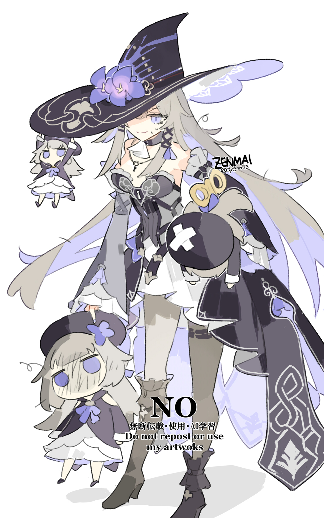1girl artist_name asymmetrical_legwear bare_shoulders black_choker black_dress black_hat character_doll choker detached_sleeves doll dress flower grey_hair hat hat_flower herta_(honkai:_star_rail) herta_(puppet)_(honkai:_star_rail) highres honkai:_star_rail honkai_(series) long_hair purple_eyes purple_flower simple_background the_herta_(honkai:_star_rail) twitter_username watermark white_background wide_brim witch_hat zenmai_(cyenmi3)