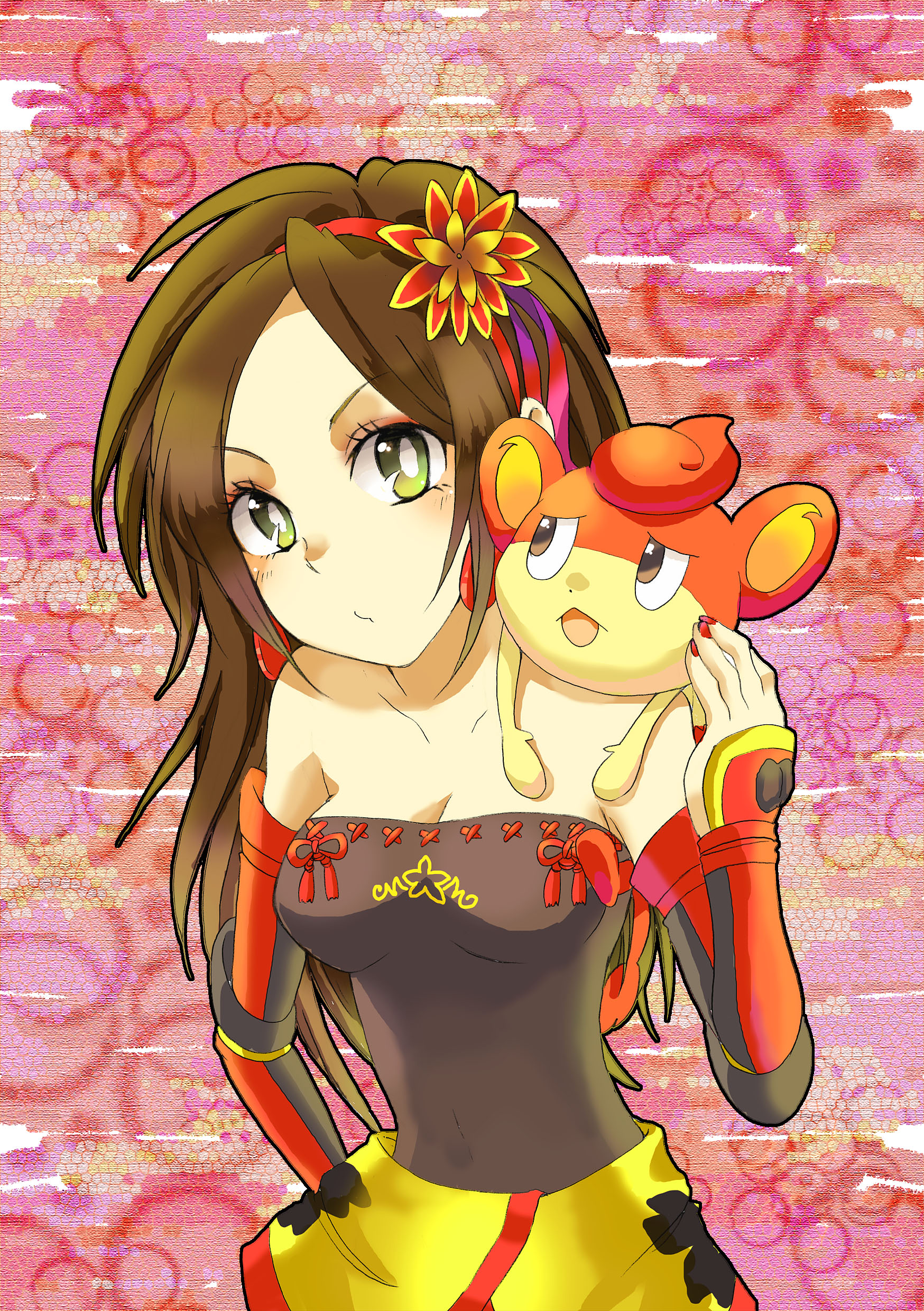 absurdres breasts brown_hair cleavage corset detached_sleeves earrings eyelashes eyeliner fingernails gen_5_pokemon green_eyes hair_ornament hairband highres japanese_clothes jewelry kai_(sengoku_musou) long_hair makeup nintendo on_shoulder pansear parted_bangs pokemon pokemon_(creature) pokemon_conquest pokemon_on_shoulder red_nails ribbon_trim sengoku_musou skirt vambraces yellow_skirt