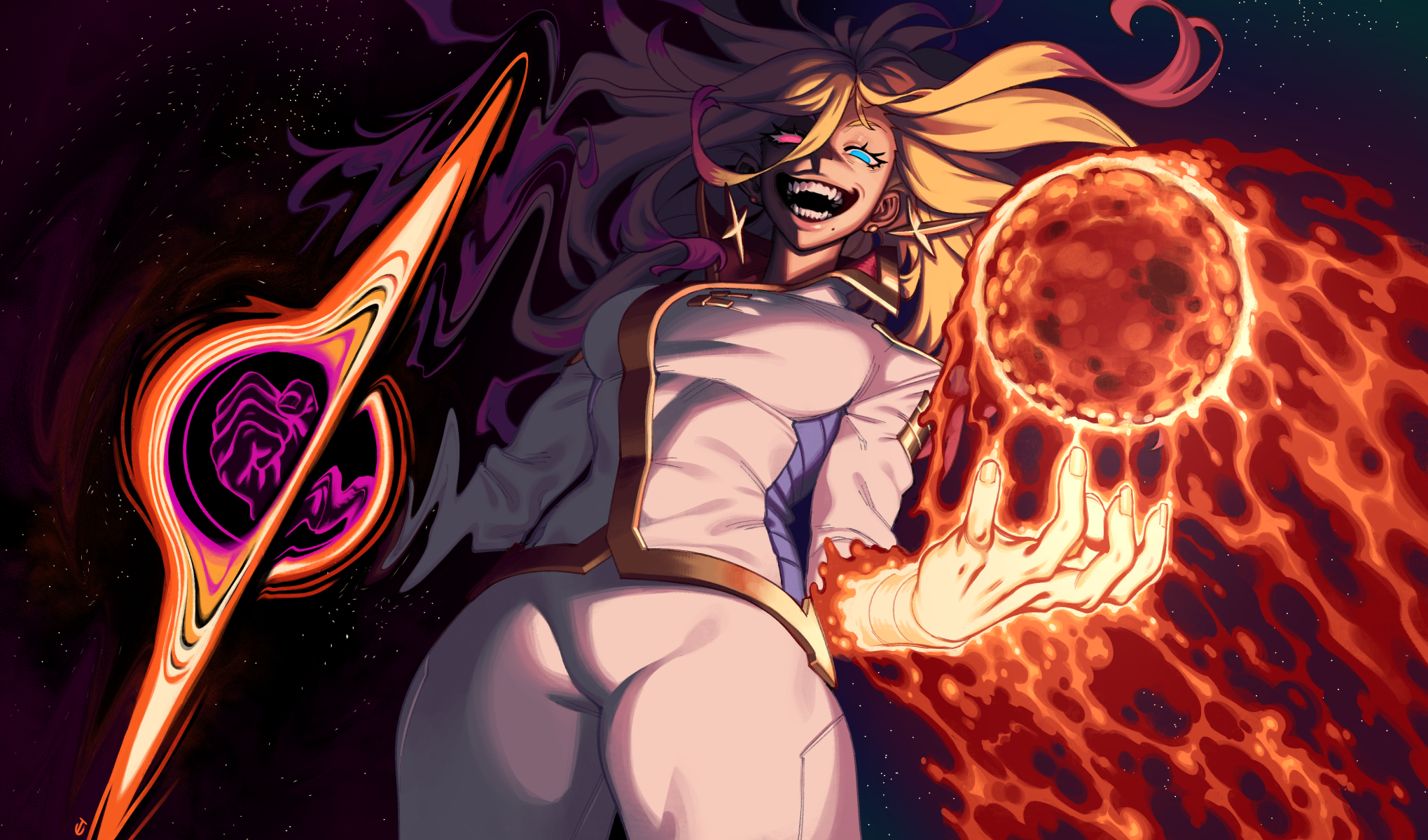 1girl black_hole blonde_hair commentary earrings eigaka english_commentary fire highres jewelry long_hair mole mole_under_mouth open_mouth original solaria_(void_dot_exe) solo space star_(sky) stud_earrings sun