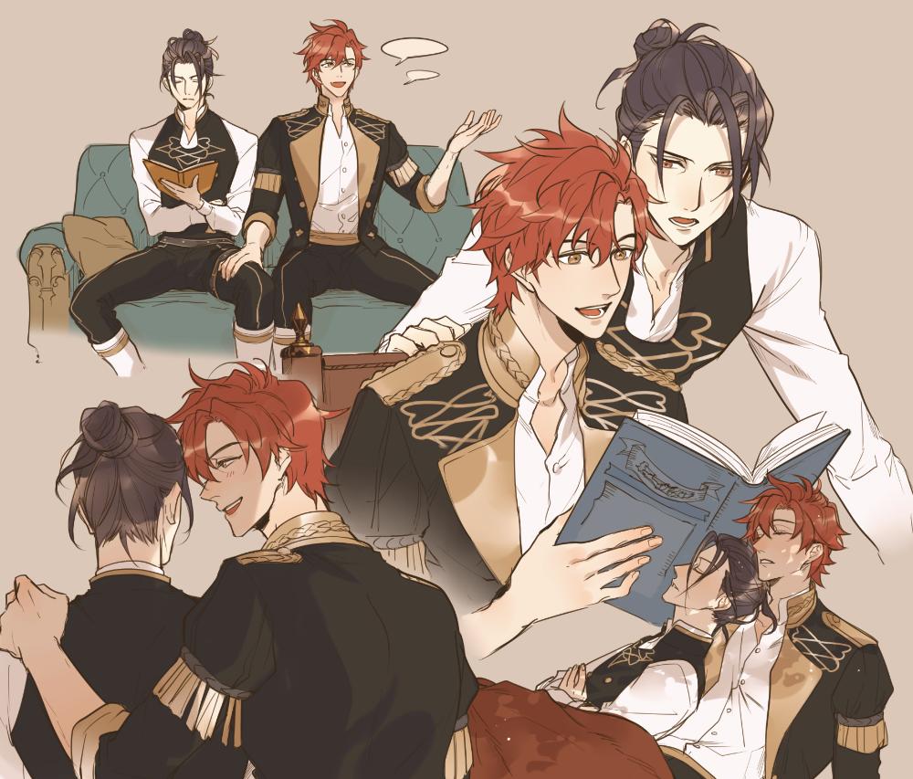 2boys arm_around_shoulder arm_up black_hair black_jacket black_pants black_vest blank_speech_bubble book boots brown_background brown_eyes chair closed_eyes collared_shirt commentary_request couch dress_shirt felix_hugo_fraldarius fire_emblem fire_emblem:_three_houses hair_bun hand_on_another's_thigh holding holding_book jacket katsura_(guiyuy) lapels leaning_back leaning_on_person looking_at_another male_focus multiple_boys multiple_views nintendo on_chair open_book open_clothes open_collar open_jacket open_mouth orange_eyes pants parted_bangs parted_lips pillow reading red_hair shirt shirt_tucked_in side-by-side simple_background single_hair_bun sitting sleeping speech_bubble sylvain_jose_gautier tassel teeth tongue triangle_mouth vest white_footwear white_shirt