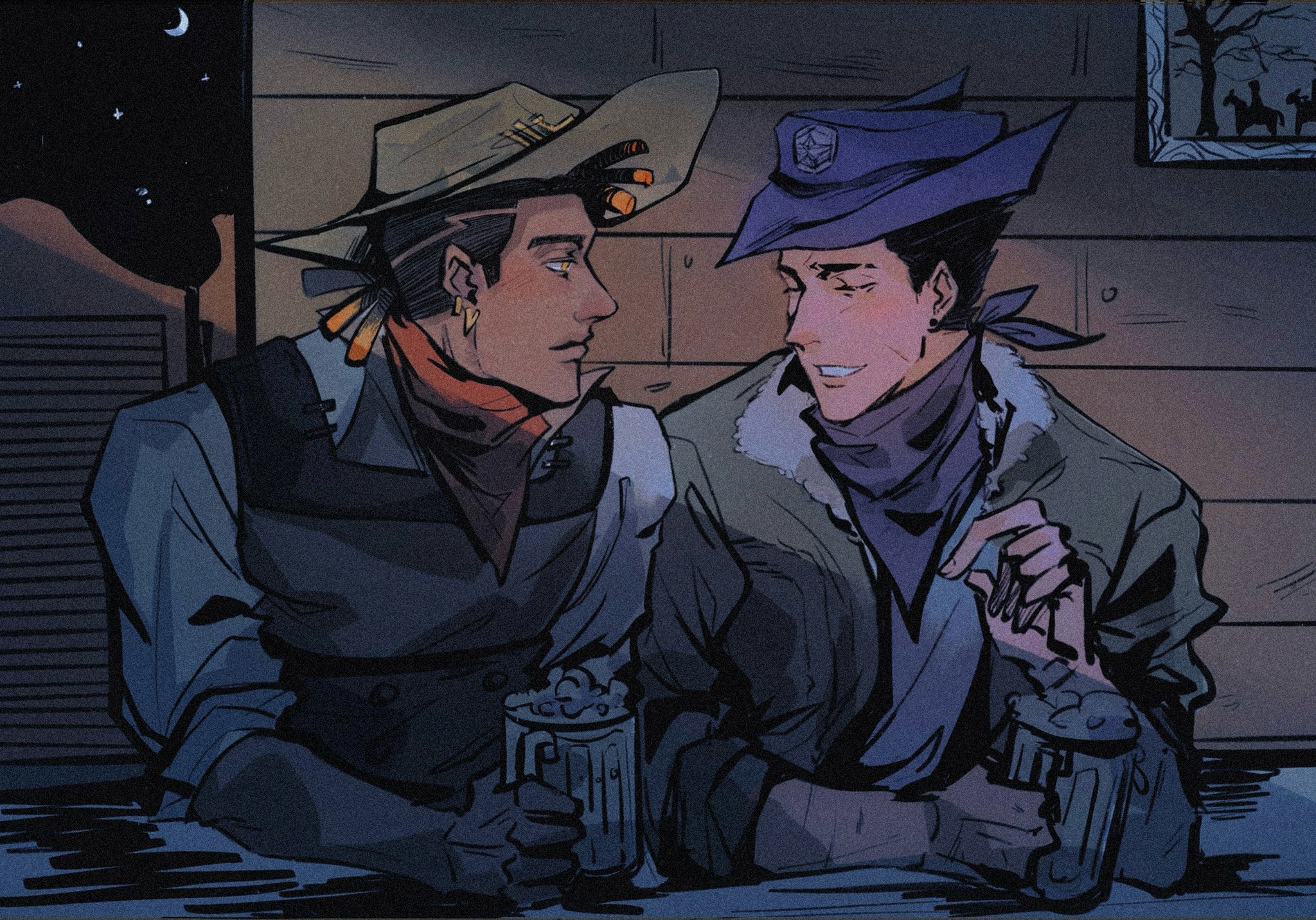 2boys alcohol alternate_universe bandana bandana_around_neck beer black_hair black_vest blue_bandana blue_hat brown_hat chinese_commentary closed_eyes commentary_request cowboy cowboy_hat cowboy_western crescent_moon cup dark-skinned_male dark_skin dreadlocks fur-trimmed_collar fur_trim grey_jacket grin hat highres holding holding_cup jacket male_focus moon multiple_boys night phoenix_(valorant) picture_frame red_bandana ro42690 shirt short_hair side-by-side sideburns sitting sky sleeves_rolled_up smile star_(sky) teeth valorant vest western white_shirt yellow_eyes yoru_(valorant)
